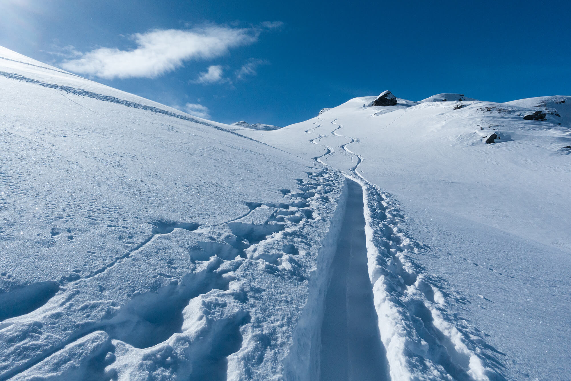 Rasch befinden wir uns in der Höhe. Die erste Seilbahn bringt uns auf das Hoadl, wo der Startpunkt der Tour liegt. Die Felle können erst mal im Rucksack bleiben, denn eine schöne Abfahrt führt hinab ins Senderstal. Das Gelände bestmöglich nützend fahren wir ab, bis zu einem Punkt am Bachlauf. Über die Sommerroute geht's von dort nach oben zur Adolf-Pichler-Hütte.