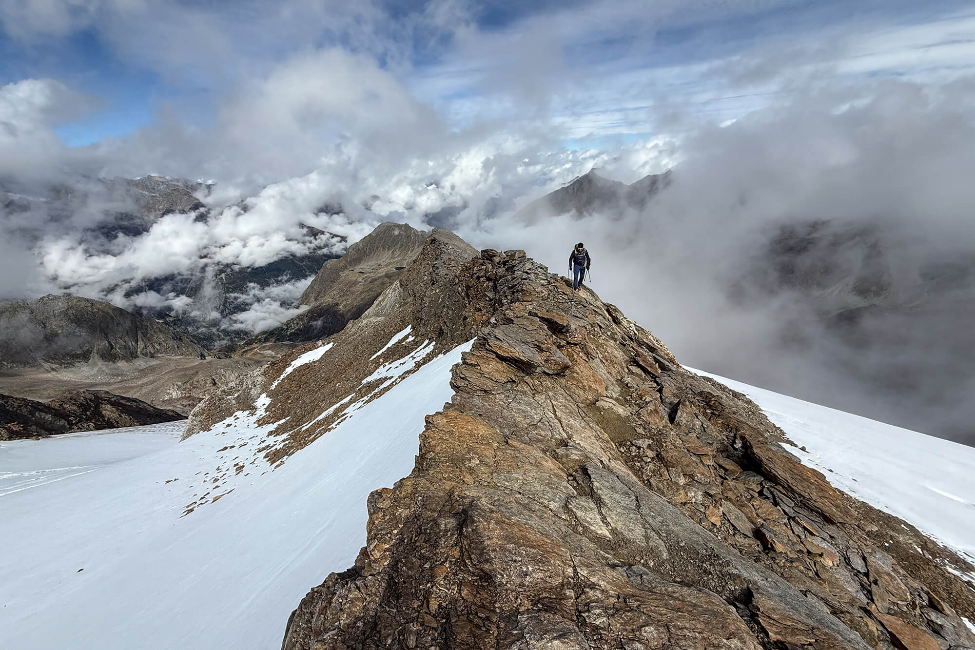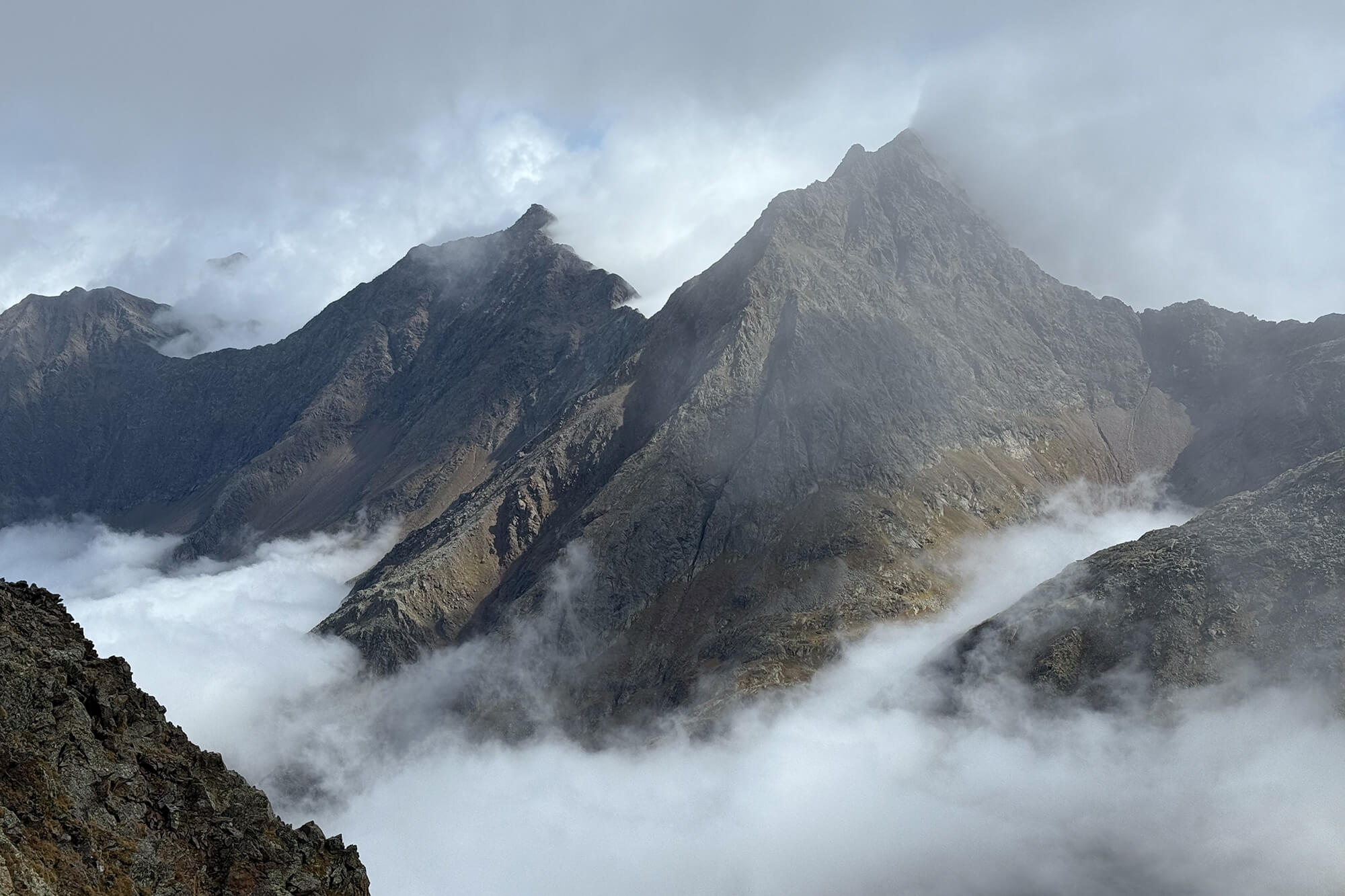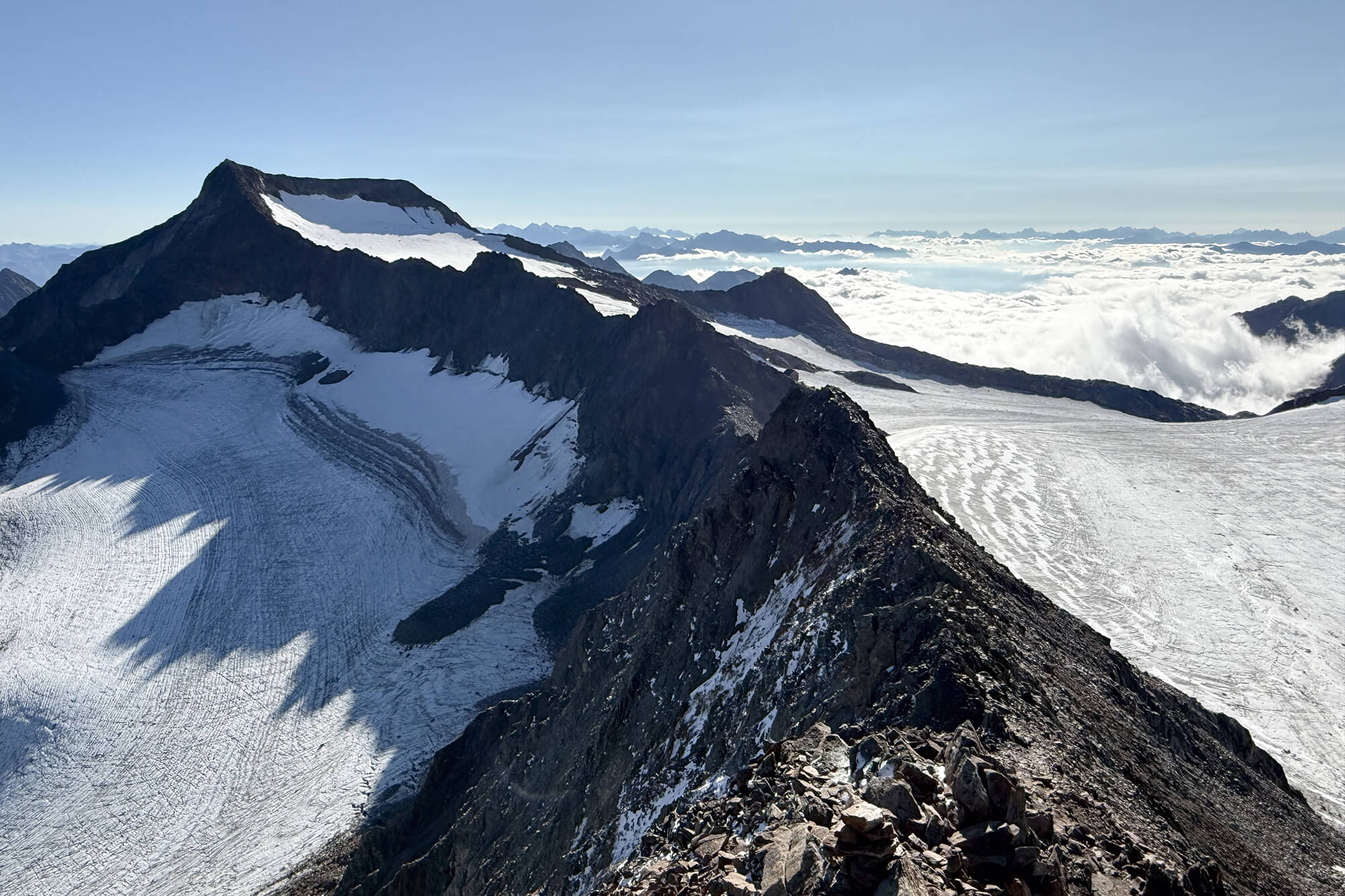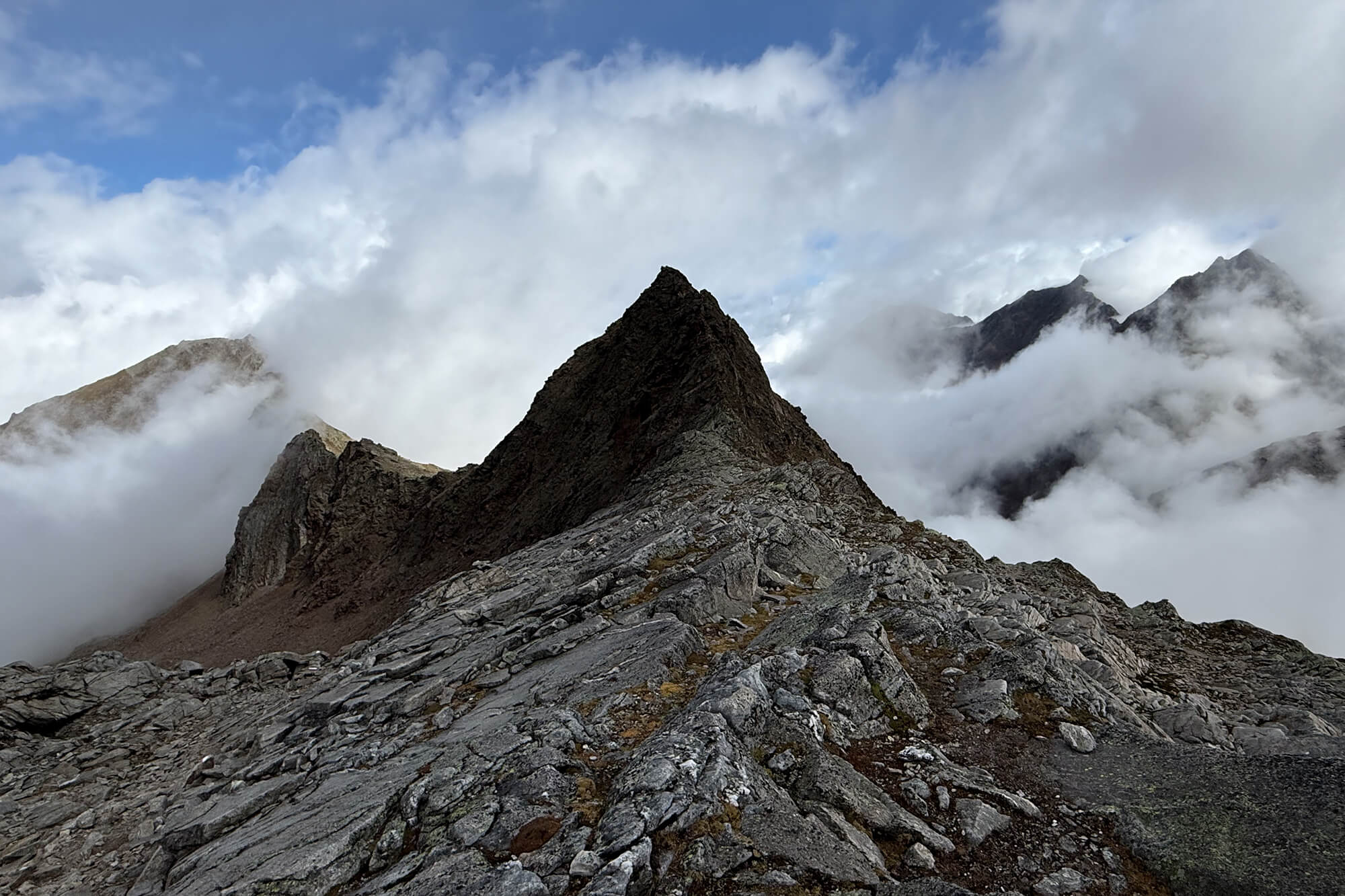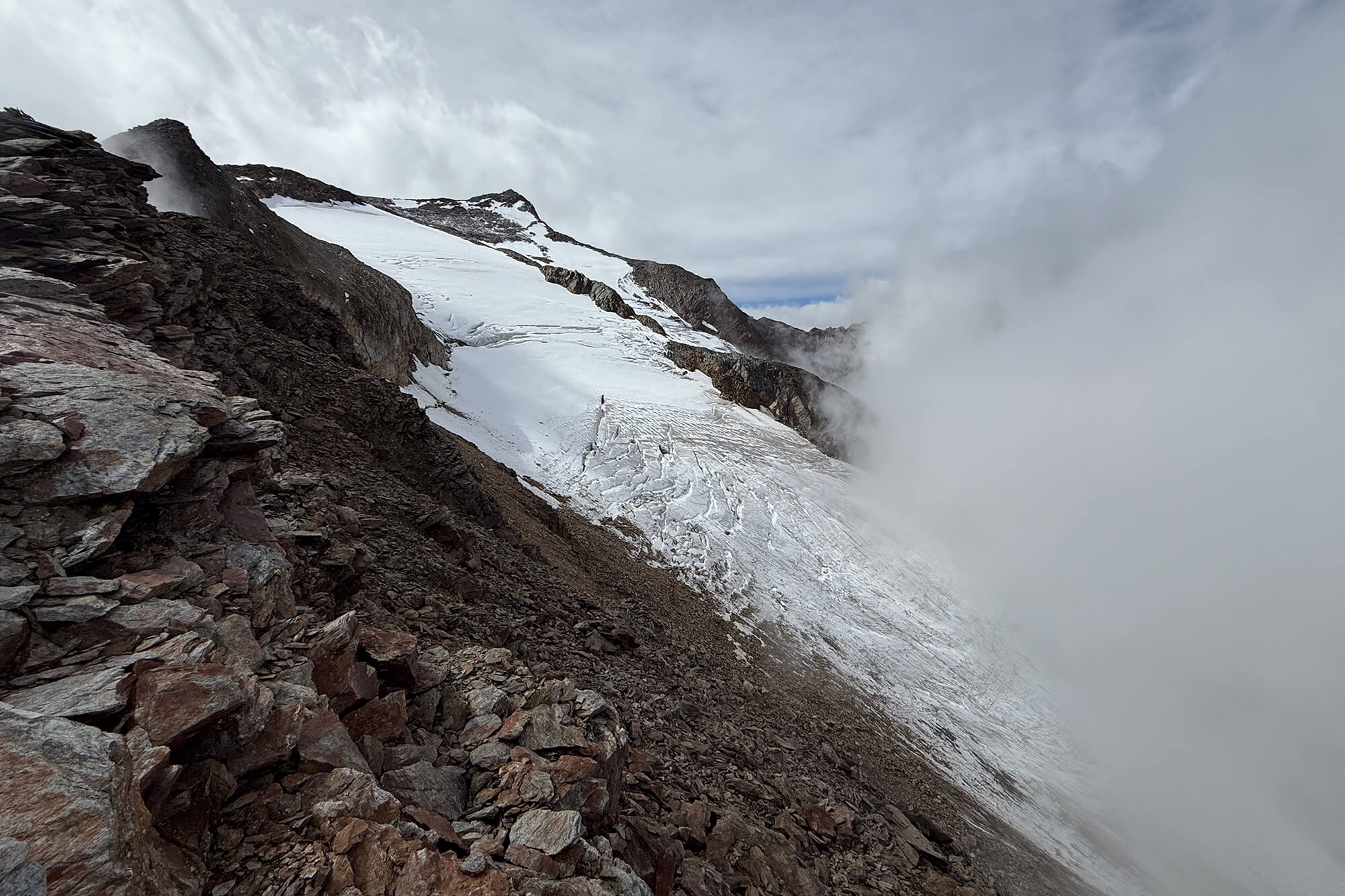Den Wilden Freiger vom Tal aus zu besteigen erfordert gute Kondition. Insgesamt knapp 2.000 Höhenmeter sind zu bewältigen und es gibt im Anstieg kaum Flachstücke. Bis zur Seescharte, einem Übergang zur Sulzenauhütte, wandern wir im Nebel. Ab und zu ergibt sich ein beeindruckender Blick zu den Feuersteinen oder zu den türkis farbenen Freiger Seen. Wir wissen, dass es irgendwann aufreisst und man spürt förmlich, wie die Sonne von oben herab freimacht. Bei einer Wegmarkierung, einem großen Steinmännchen auf ca. 3.000m Seehöhe, klart es auf. Der Freiger rückt ins Bild und auch die von ihm nach Norden abfließenden Gletscherarme. Ich erzähle Thomas von meiner ersten Besteigung als 14-Jähriger - damals ebenfalls vom Tal aus und noch mit Gletscherberührung. Die verfallene Zollhütte knapp unterhalb des Signalgipfels ist mit Anraum versehen. Trotz Sonnenschein ist die Luft klar und kühl. Am Gipfel sitzen wir kurz alleine. Einige Bergsteiger:innen steigen über den Grat zum Becherhaus ab und in Kürze werden wir ihnen folgen.