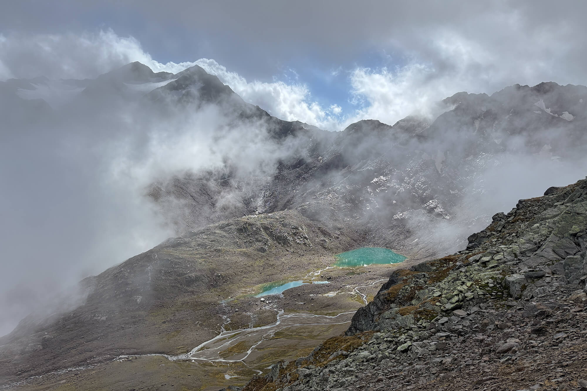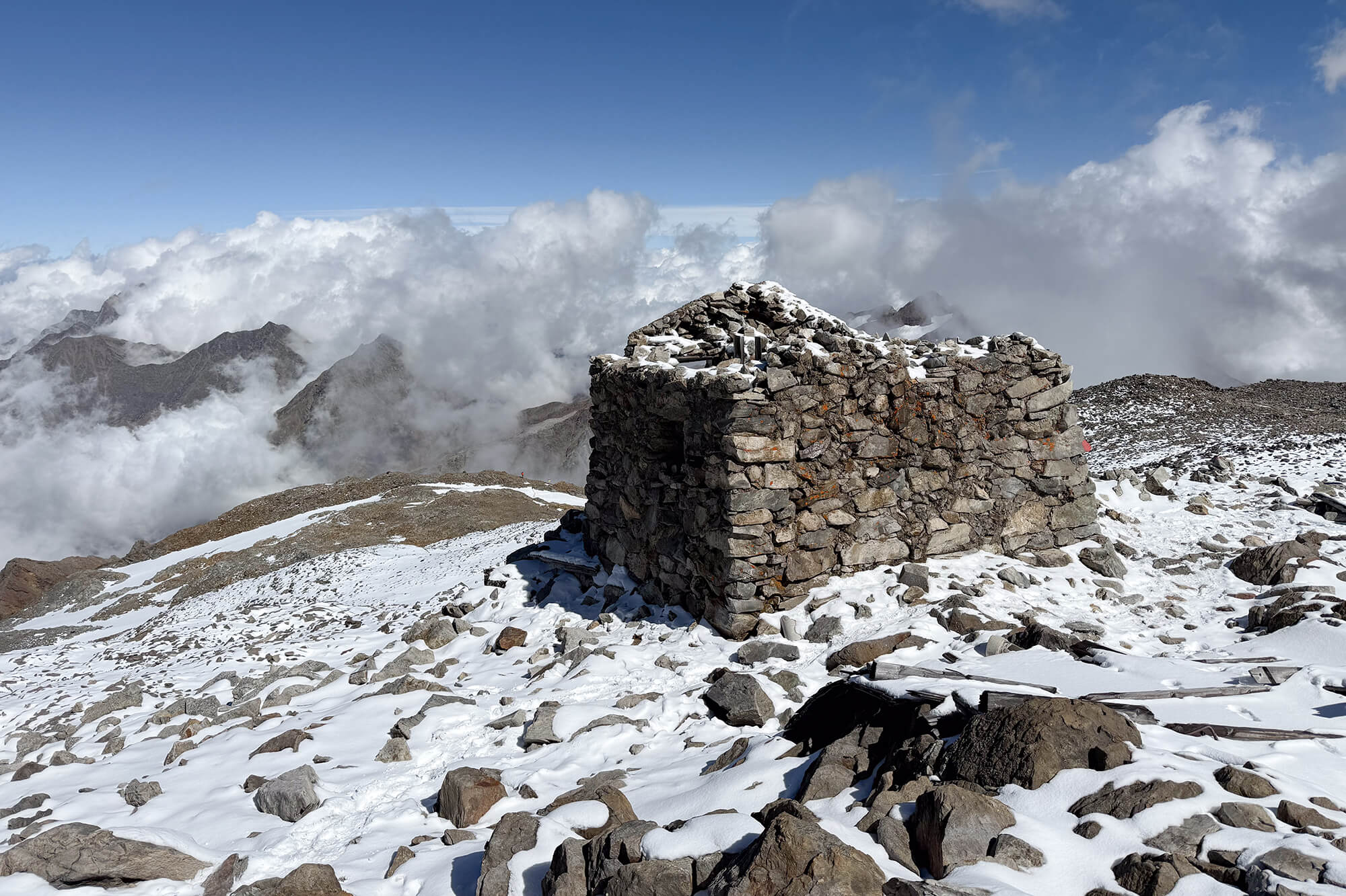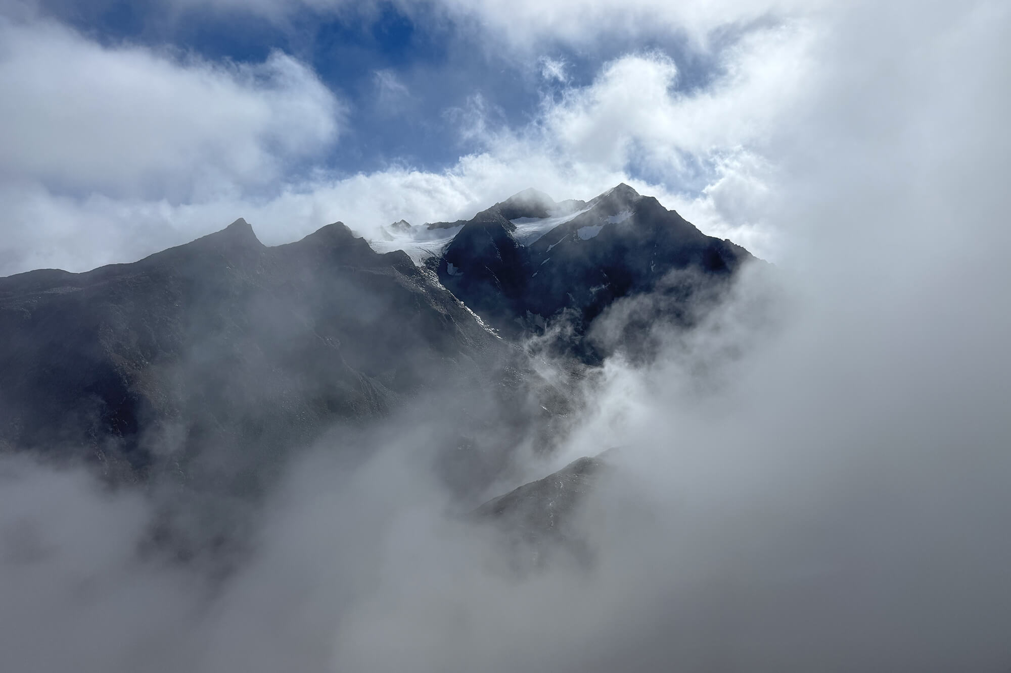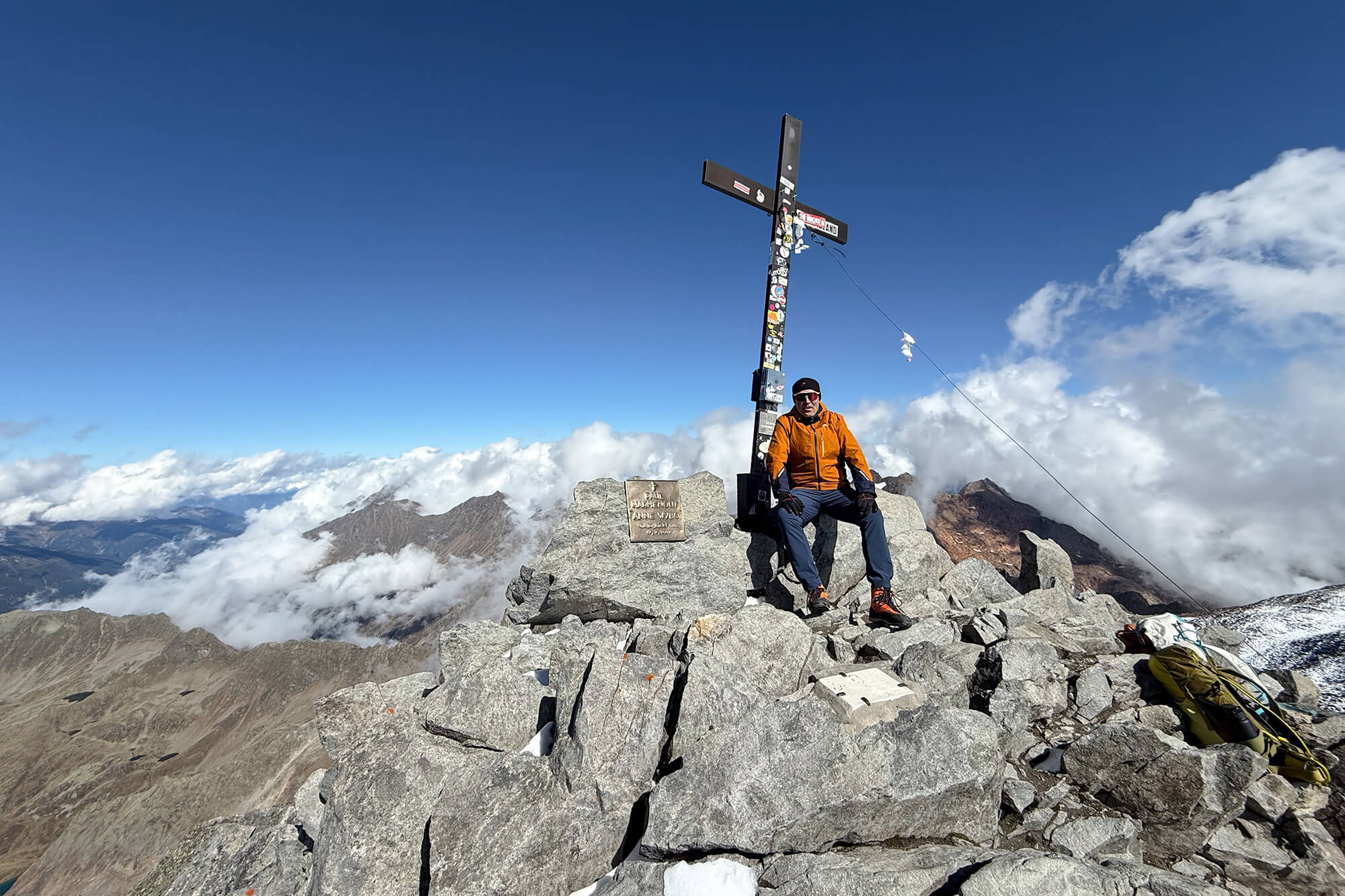 Den Wilden Freiger vom Tal aus zu besteigen erfordert gute Kondition. Insgesamt knapp 2.000 Höhenmeter sind zu bewältigen und es gibt im Anstieg kaum Flachstücke. Bis zur Seescharte, einem Übergang zur Sulzenauhütte, wandern wir im Nebel. Ab und zu ergibt sich ein beeindruckender Blick zu den Feuersteinen oder zu den türkis farbenen Freiger Seen. Wir wissen, dass es irgendwann aufreisst und man spürt förmlich, wie die Sonne von oben herab freimacht. Bei einer Wegmarkierung, einem großen Steinmännchen auf ca. 3.000m Seehöhe, klart es auf. Der Freiger rückt ins Bild und auch die von ihm nach Norden abfließenden Gletscherarme. Ich erzähle Thomas von meiner ersten Besteigung als 14-Jähriger - damals ebenfalls vom Tal aus und noch mit Gletscherberührung. Die verfallene Zollhütte knapp unterhalb des Signalgipfels ist mit Anraum versehen. Trotz Sonnenschein ist die Luft klar und kühl. Am Gipfel sitzen wir kurz alleine. Einige Bergsteiger:innen steigen über den Grat zum Becherhaus ab und in Kürze werden wir ihnen folgen.