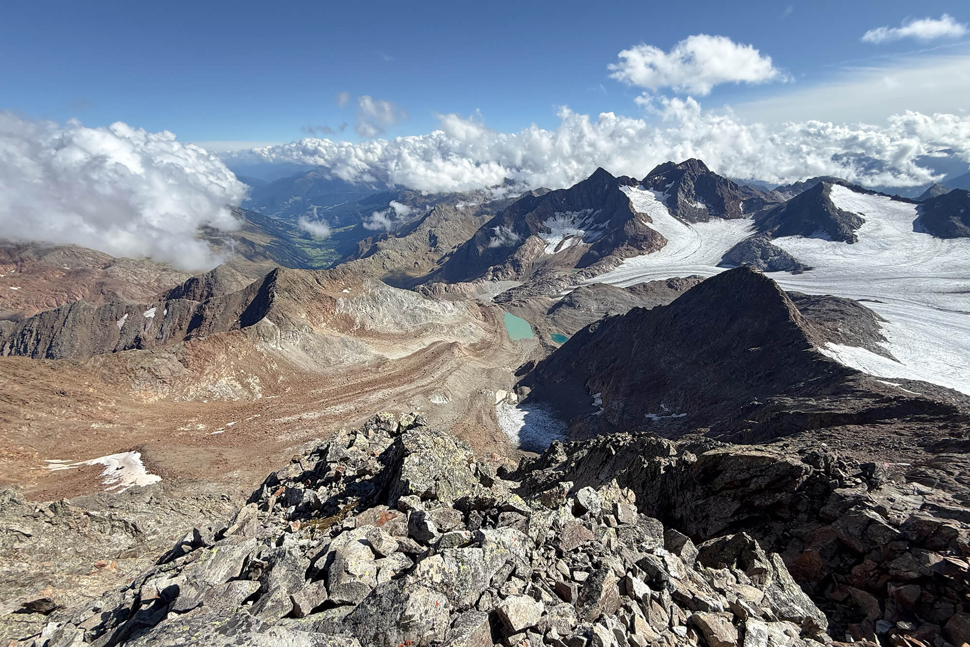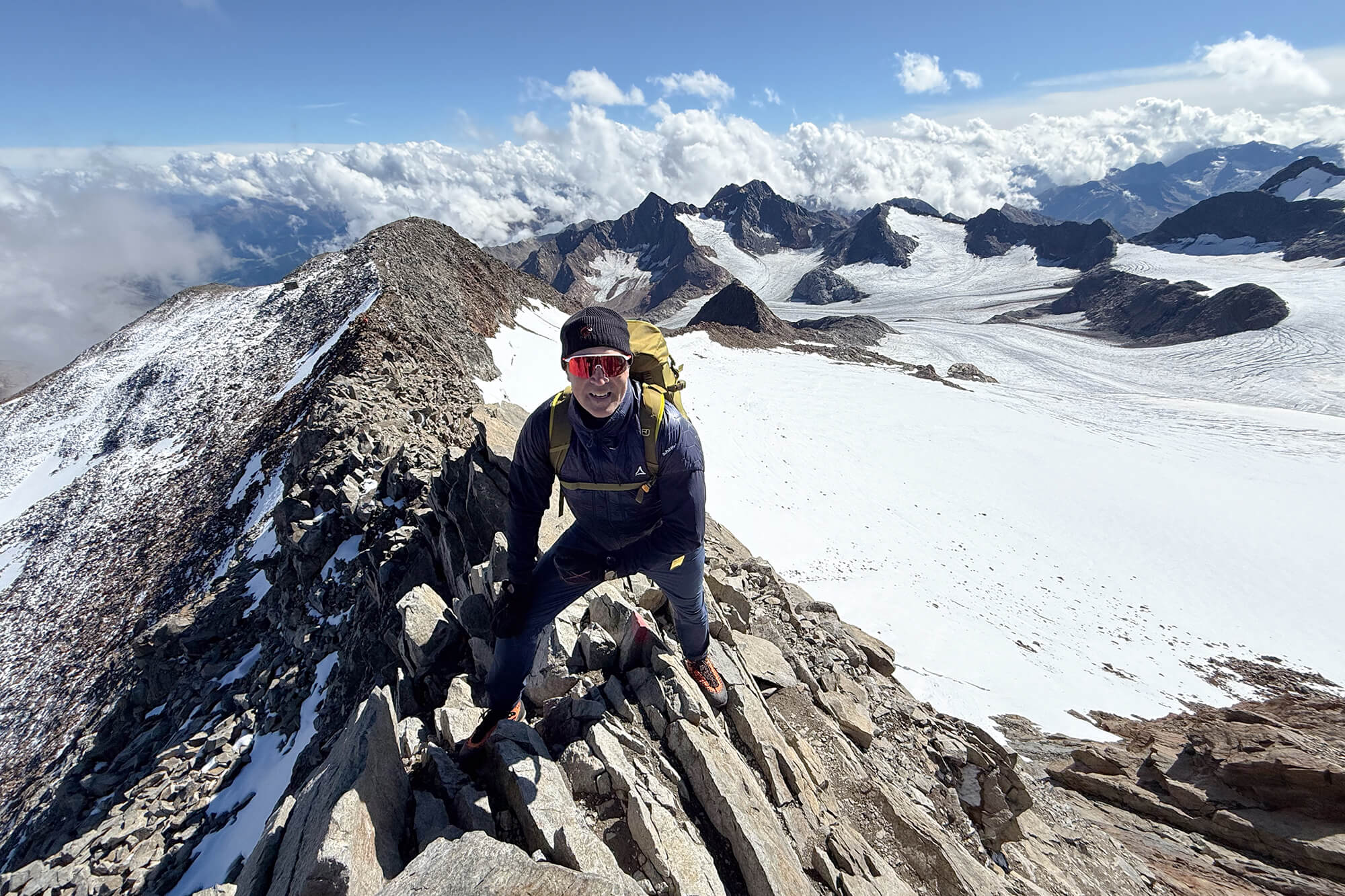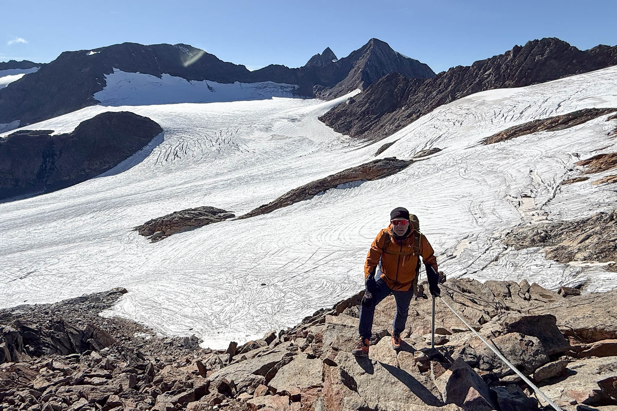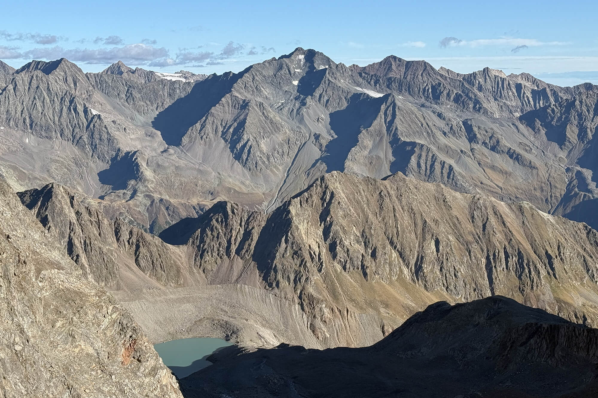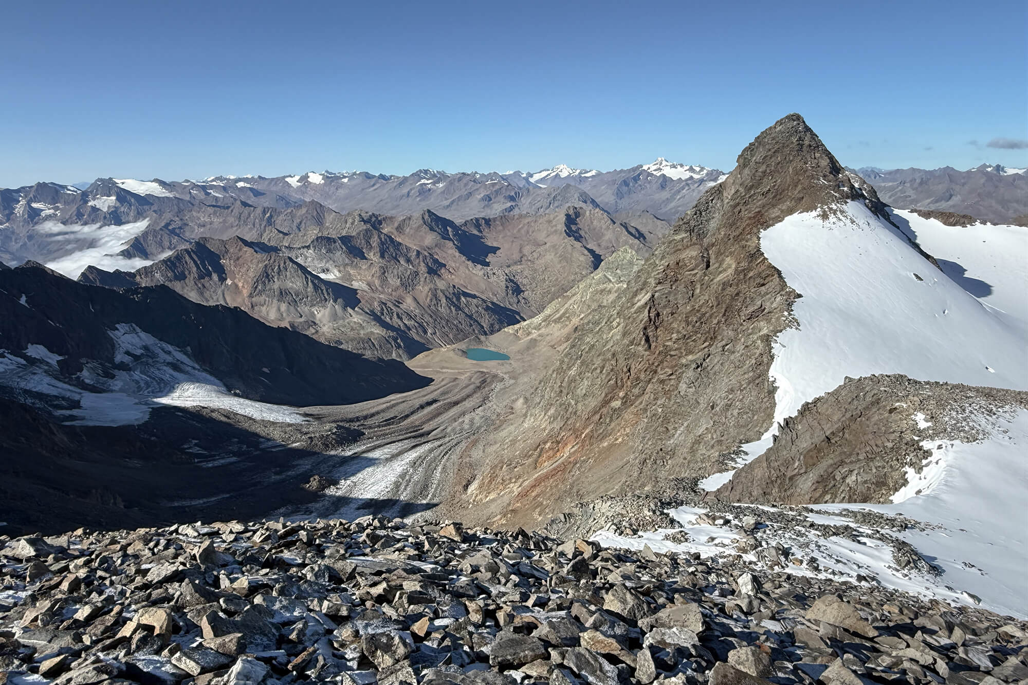 Den Wilden Freiger vom Tal aus zu besteigen erfordert gute Kondition. Insgesamt knapp 2.000 Höhenmeter sind zu bewältigen und es gibt im Anstieg kaum Flachstücke. Bis zur Seescharte, einem Übergang zur Sulzenauhütte, wandern wir im Nebel. Ab und zu ergibt sich ein beeindruckender Blick zu den Feuersteinen oder zu den türkis farbenen Freiger Seen. Wir wissen, dass es irgendwann aufreisst und man spürt förmlich, wie die Sonne von oben herab freimacht. Bei einer Wegmarkierung, einem großen Steinmännchen auf ca. 3.000m Seehöhe, klart es auf. Der Freiger rückt ins Bild und auch die von ihm nach Norden abfließenden Gletscherarme. Ich erzähle Thomas von meiner ersten Besteigung als 14-Jähriger - damals ebenfalls vom Tal aus und noch mit Gletscherberührung. Die verfallene Zollhütte knapp unterhalb des Signalgipfels ist mit Anraum versehen. Trotz Sonnenschein ist die Luft klar und kühl. Am Gipfel sitzen wir kurz alleine. Einige Bergsteiger:innen steigen über den Grat zum Becherhaus ab und in Kürze werden wir ihnen folgen.