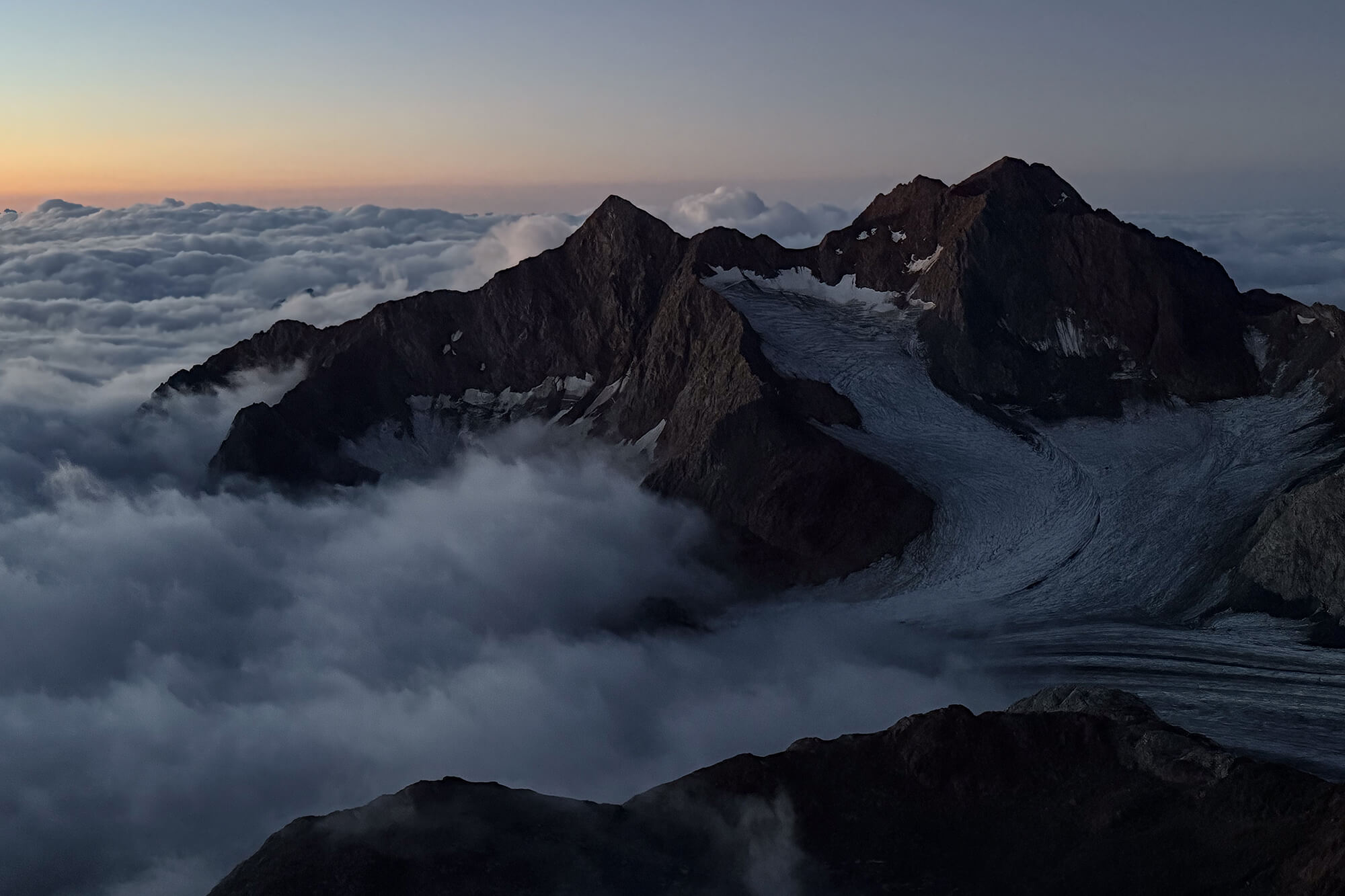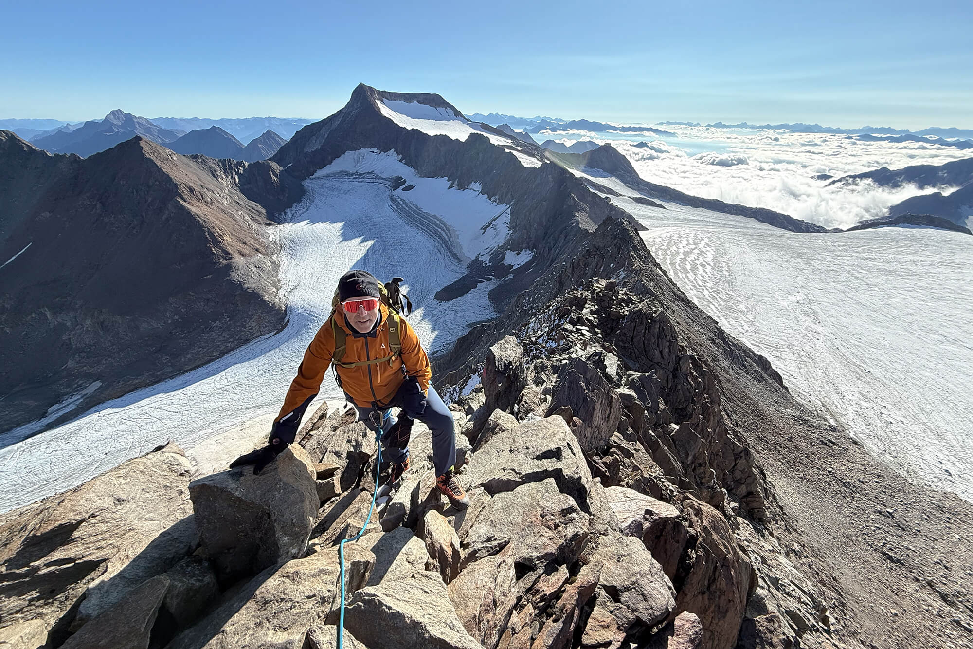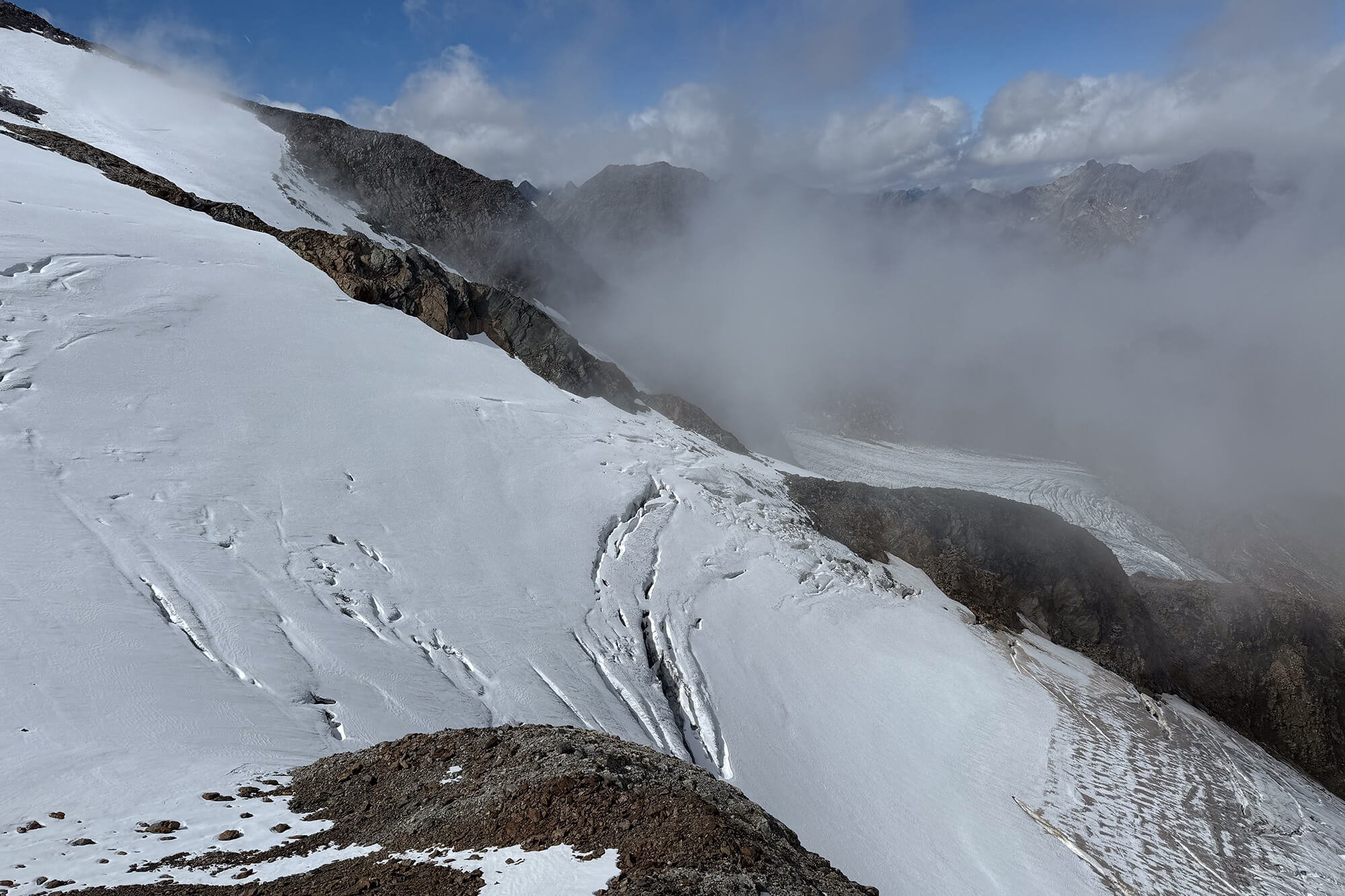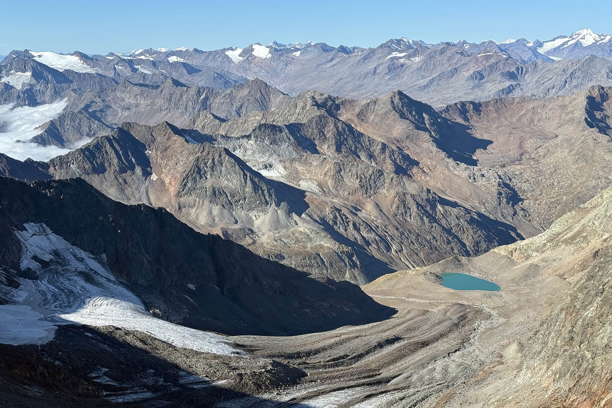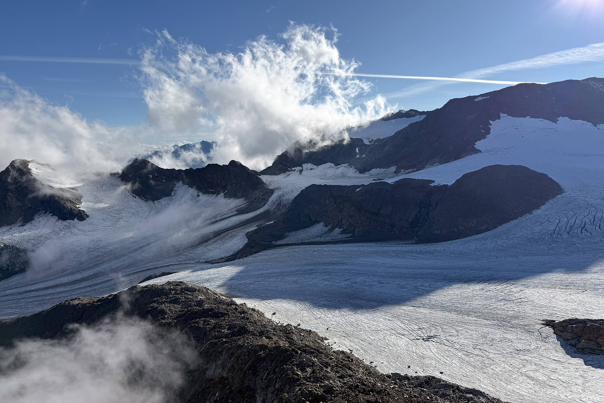 Den Wilden Freiger vom Tal aus zu besteigen erfordert gute Kondition. Insgesamt knapp 2.000 Höhenmeter sind zu bewältigen und es gibt im Anstieg kaum Flachstücke. Bis zur Seescharte, einem Übergang zur Sulzenauhütte, wandern wir im Nebel. Ab und zu ergibt sich ein beeindruckender Blick zu den Feuersteinen oder zu den türkis farbenen Freiger Seen. Wir wissen, dass es irgendwann aufreisst und man spürt förmlich, wie die Sonne von oben herab freimacht. Bei einer Wegmarkierung, einem großen Steinmännchen auf ca. 3.000m Seehöhe, klart es auf. Der Freiger rückt ins Bild und auch die von ihm nach Norden abfließenden Gletscherarme. Ich erzähle Thomas von meiner ersten Besteigung als 14-Jähriger - damals ebenfalls vom Tal aus und noch mit Gletscherberührung. Die verfallene Zollhütte knapp unterhalb des Signalgipfels ist mit Anraum versehen. Trotz Sonnenschein ist die Luft klar und kühl. Am Gipfel sitzen wir kurz alleine. Einige Bergsteiger:innen steigen über den Grat zum Becherhaus ab und in Kürze werden wir ihnen folgen.