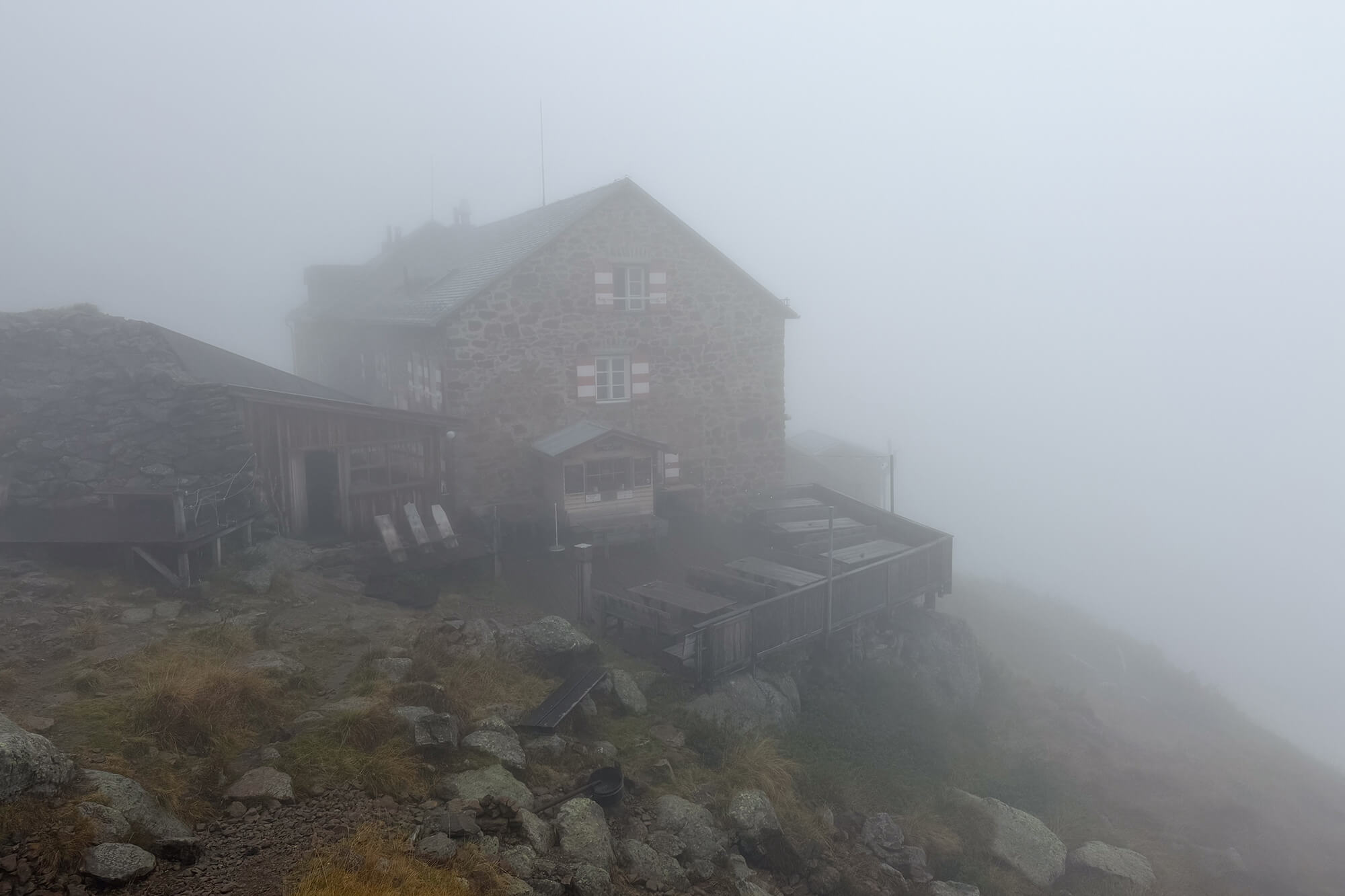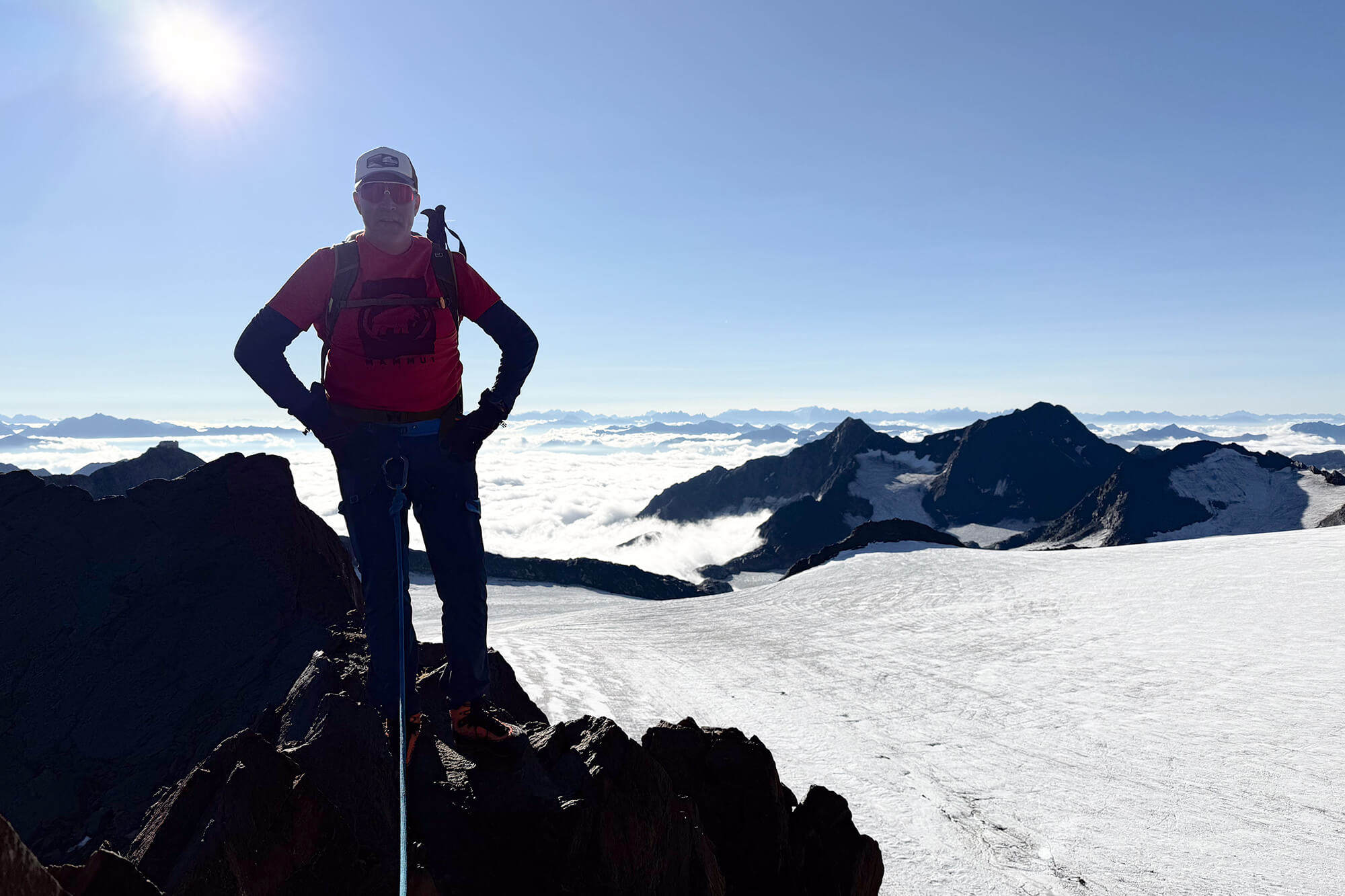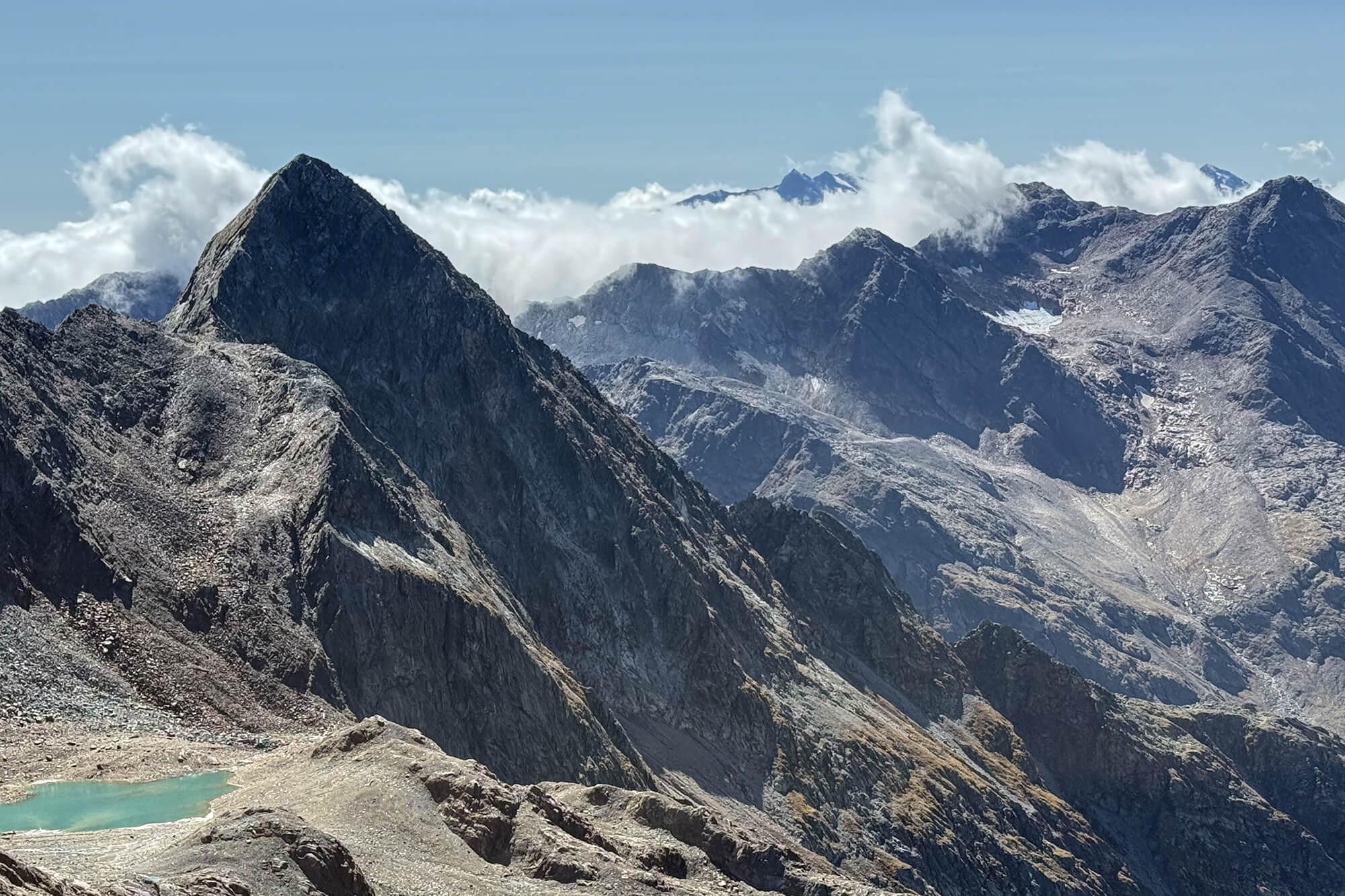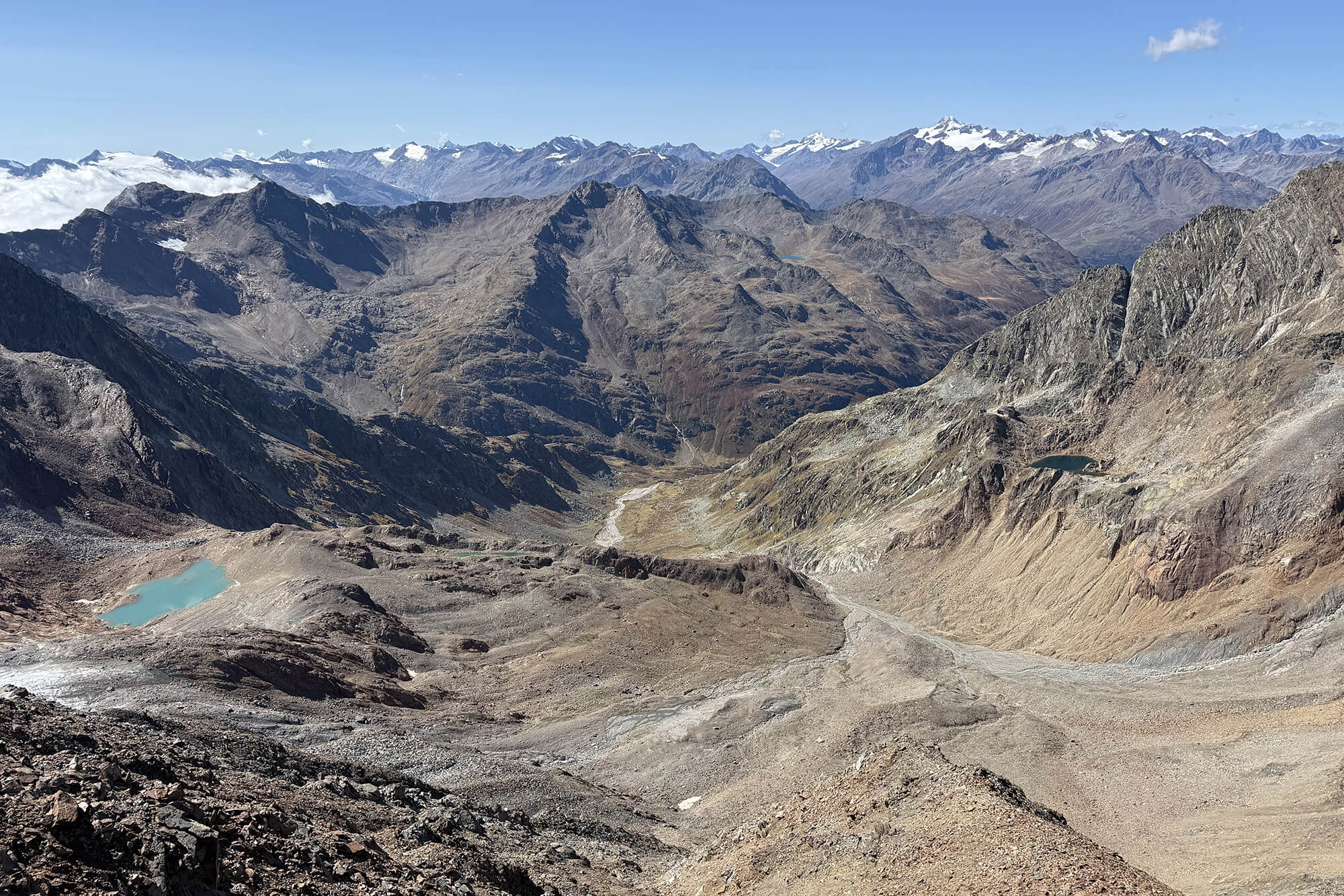 Den Wilden Freiger vom Tal aus zu besteigen erfordert gute Kondition. Insgesamt knapp 2.000 Höhenmeter sind zu bewältigen und es gibt im Anstieg kaum Flachstücke. Bis zur Seescharte, einem Übergang zur Sulzenauhütte, wandern wir im Nebel. Ab und zu ergibt sich ein beeindruckender Blick zu den Feuersteinen oder zu den türkis farbenen Freiger Seen. Wir wissen, dass es irgendwann aufreisst und man spürt förmlich, wie die Sonne von oben herab freimacht. Bei einer Wegmarkierung, einem großen Steinmännchen auf ca. 3.000m Seehöhe, klart es auf. Der Freiger rückt ins Bild und auch die von ihm nach Norden abfließenden Gletscherarme. Ich erzähle Thomas von meiner ersten Besteigung als 14-Jähriger - damals ebenfalls vom Tal aus und noch mit Gletscherberührung. Die verfallene Zollhütte knapp unterhalb des Signalgipfels ist mit Anraum versehen. Trotz Sonnenschein ist die Luft klar und kühl. Am Gipfel sitzen wir kurz alleine. Einige Bergsteiger:innen steigen über den Grat zum Becherhaus ab und in Kürze werden wir ihnen folgen.