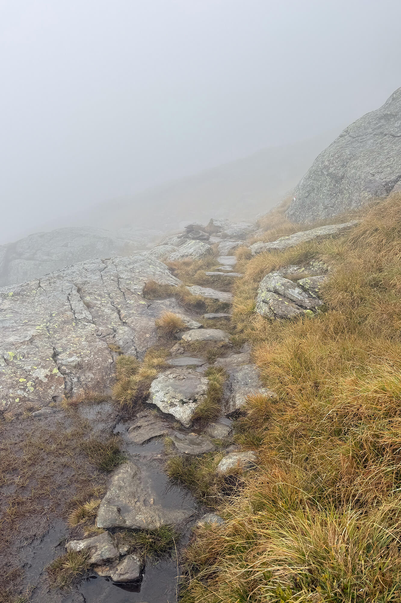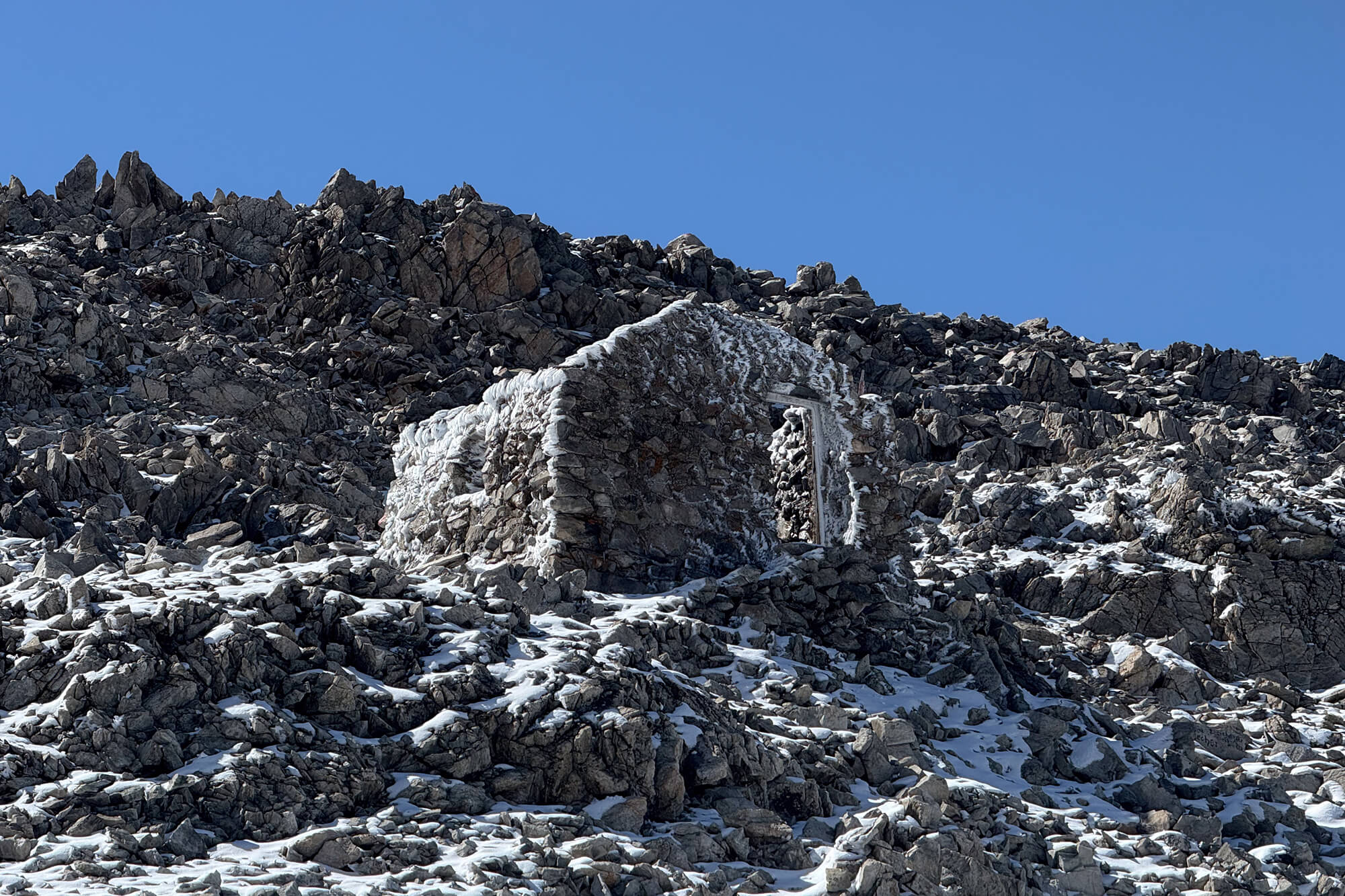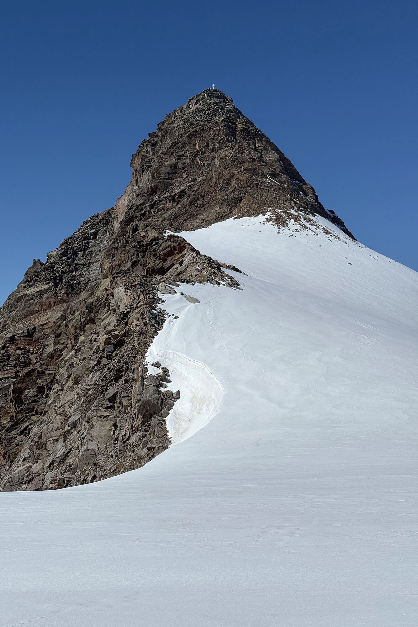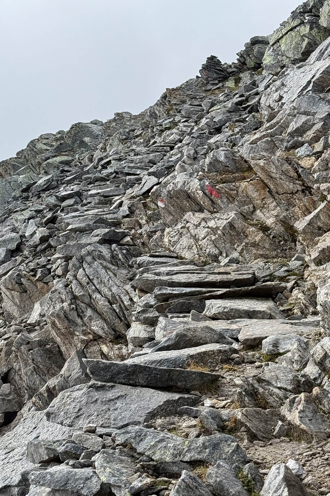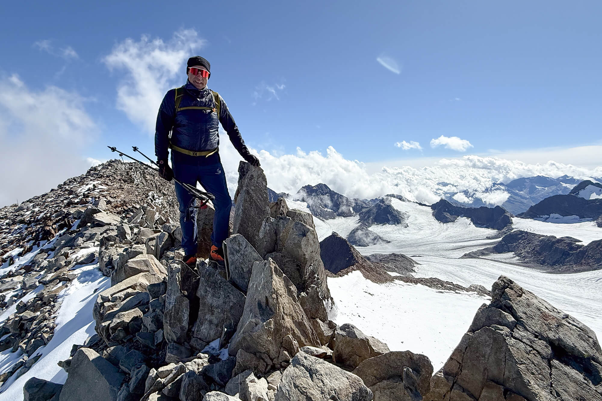 Den Wilden Freiger vom Tal aus zu besteigen erfordert gute Kondition. Insgesamt knapp 2.000 Höhenmeter sind zu bewältigen und es gibt im Anstieg kaum Flachstücke. Bis zur Seescharte, einem Übergang zur Sulzenauhütte, wandern wir im Nebel. Ab und zu ergibt sich ein beeindruckender Blick zu den Feuersteinen oder zu den türkis farbenen Freiger Seen. Wir wissen, dass es irgendwann aufreisst und man spürt förmlich, wie die Sonne von oben herab freimacht. Bei einer Wegmarkierung, einem großen Steinmännchen auf ca. 3.000m Seehöhe, klart es auf. Der Freiger rückt ins Bild und auch die von ihm nach Norden abfließenden Gletscherarme. Ich erzähle Thomas von meiner ersten Besteigung als 14-Jähriger - damals ebenfalls vom Tal aus und noch mit Gletscherberührung. Die verfallene Zollhütte knapp unterhalb des Signalgipfels ist mit Anraum versehen. Trotz Sonnenschein ist die Luft klar und kühl. Am Gipfel sitzen wir kurz alleine. Einige Bergsteiger:innen steigen über den Grat zum Becherhaus ab und in Kürze werden wir ihnen folgen.