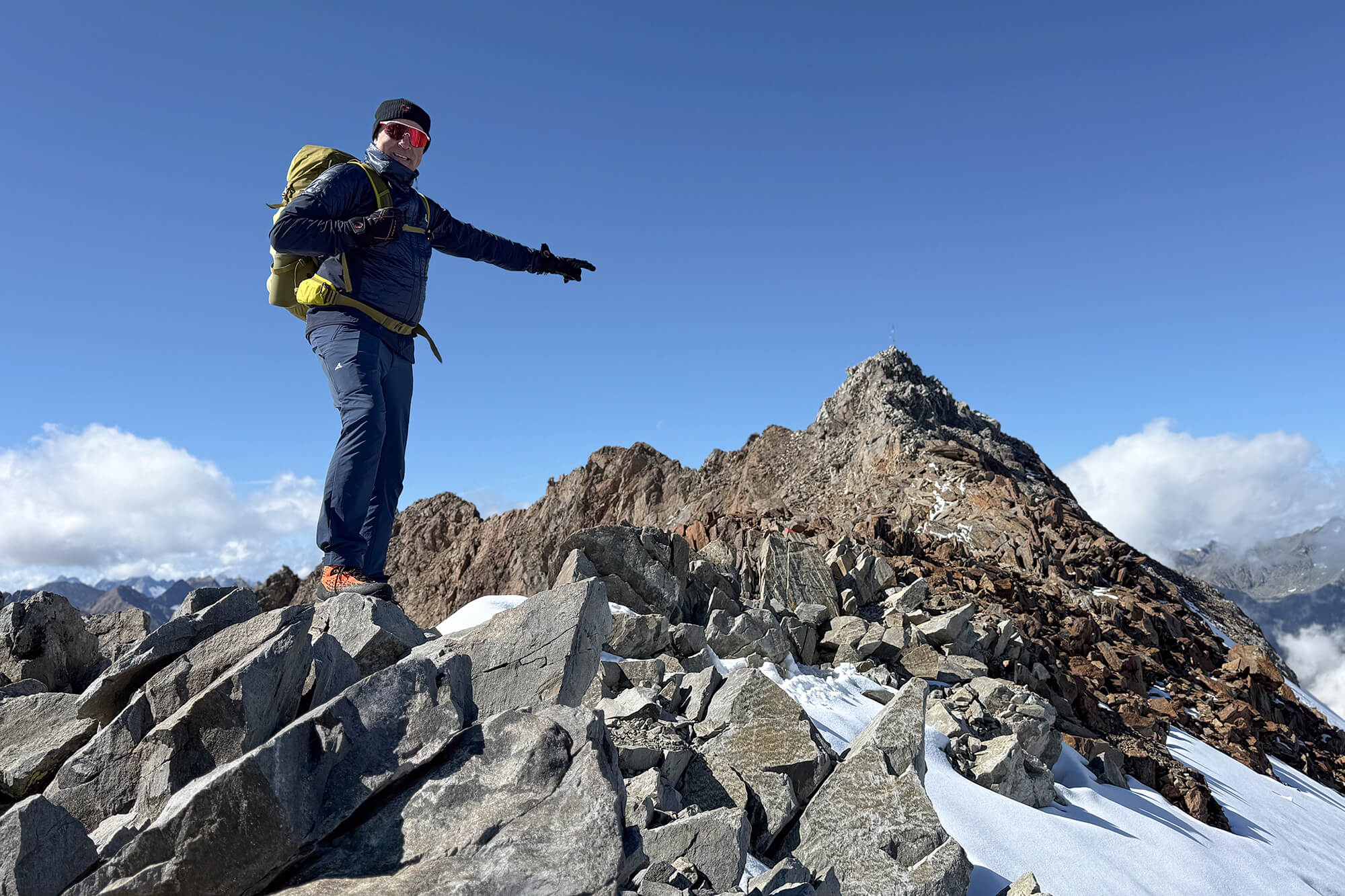 Um 6.30 Uhr nehmen wir das erste Frühstück. Der Fels am Ostgrat des Wilden Pfaff wird von der Morgensonne aufgewärmt und ohne nennenswerten Wind klettern wir zum Gipfel. Wir treffen auf ein Paar - Tommy, ein Bergführerkollege aus Bozen, ist mit seiner Partnerin unterwegs. Die beiden sind überrascht wie einsam man hier oben sein kann und wie schön diese Ecke der Stubaier Alpen um diese Jahreszeit ist. Tommy ist ein Winterfuchs, er bereist ferne Gebirge mit Ski und auch in seiner Heimat Südtirol ist er viel unterwegs. Lediglich einmal war er bislang hier oben, im Rahmen einer Skitour auf den Wilden Freiger. Wir wünschen uns Gesundheit und feine Schwünge im bevorstehenden Winter und nach einem Händedruck teilen sich unsere Wege.