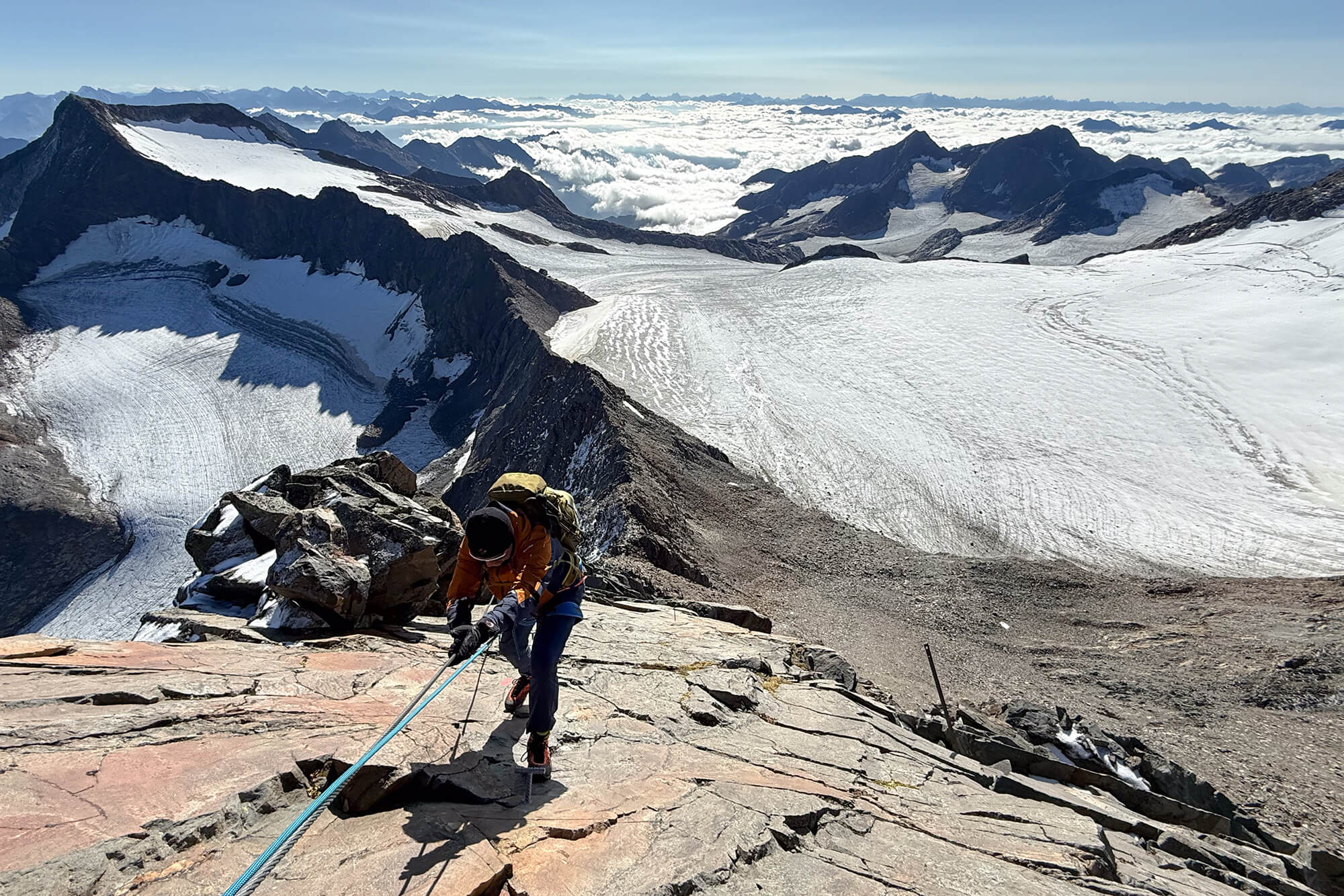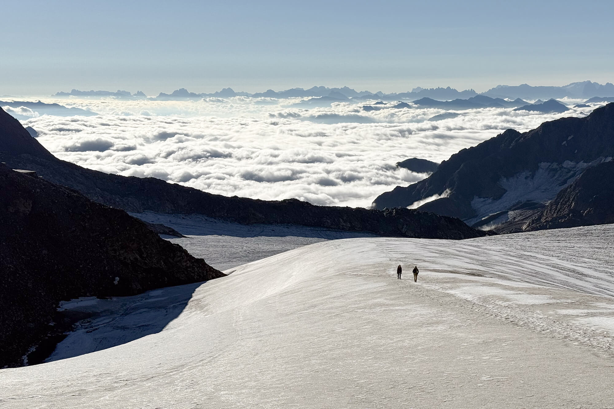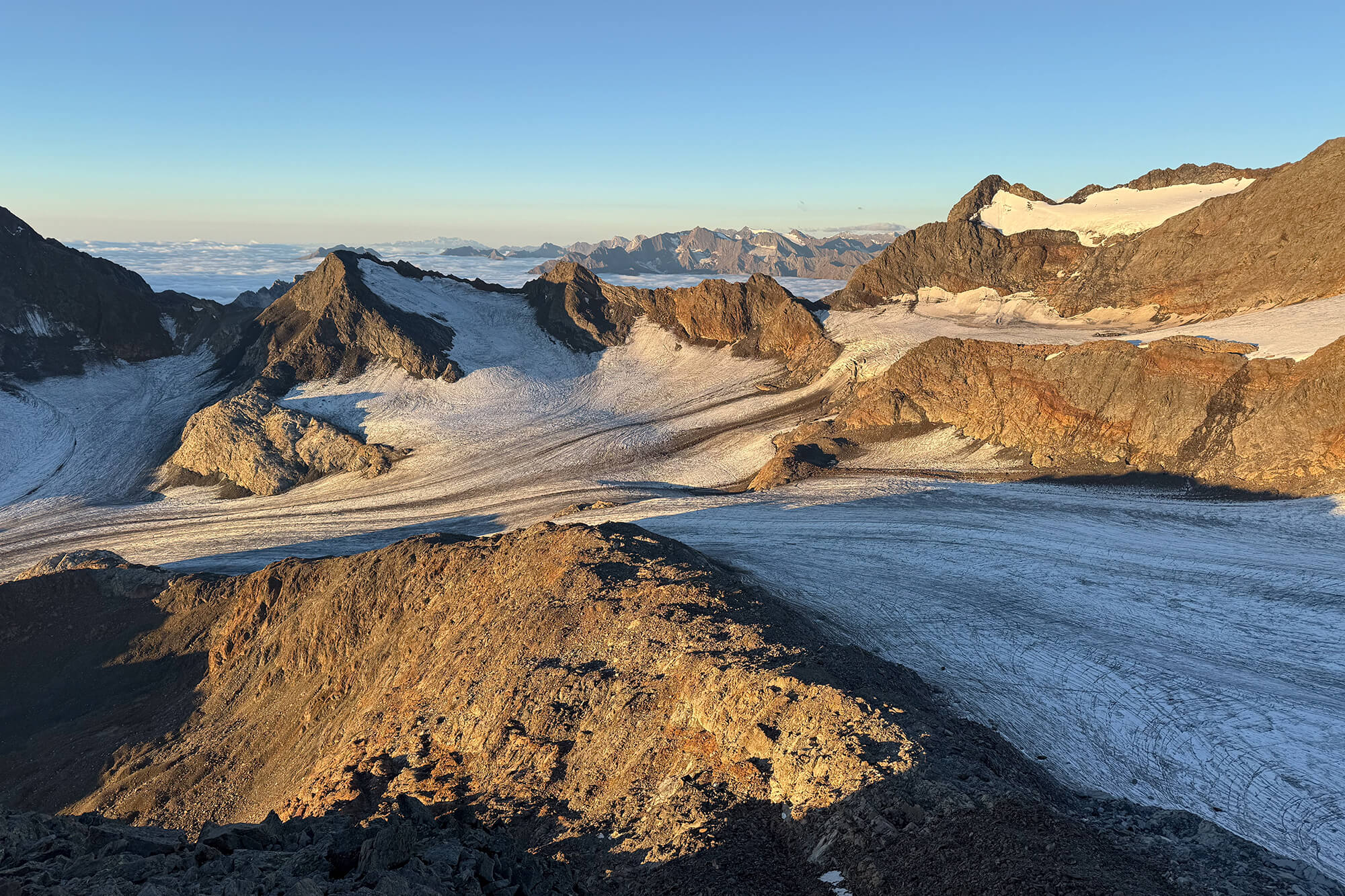 Am Pfaffensattel zwischen Zuckerhütl und Wildem Pfaff liegt der Sulzenaugletscher vor uns. Er ist frisch angezuckert und strahlt. Die Bedingungen könnten nicht besser sein. Einigen Gletscherspalten ausweichend gehen wir Richtung Westen zum Pfaffenjoch. Ein letzter Anstieg führt zum Felsrücken am Aperen Pfaff, danach beginnt der lange Abstieg über Fernau. Mehr als 24 Stunden verbringt man bei dieser Tour auf über Dreitausendmeter. Wenn man anschließend wieder tiefer gelangt, nimmt man Grün und Vegetation intensiver wahr als zuvor. An der Dresdner Hütte wartet Alex. Sie war heute bereits auf der Bänkenalm und erzählt begeistert von diesem schönen Ort. Während ein dreiköpfiges Musik-Ensamble volkstümlich musiziert kommt frischer Wind auf. Die Zeit für Hochtouren ist erst einmal vorbei. Wir leben in Einklang mit Witterung und der gegebenen Infrastruktur. Im Winter begleiten wir Skitouren aufs Zuckerhütl und den Wilden Freiger, sehr lohnende Unternehmungen. Aber erst einmal Fels und trockene Gefilde in den Herbstmonaten.