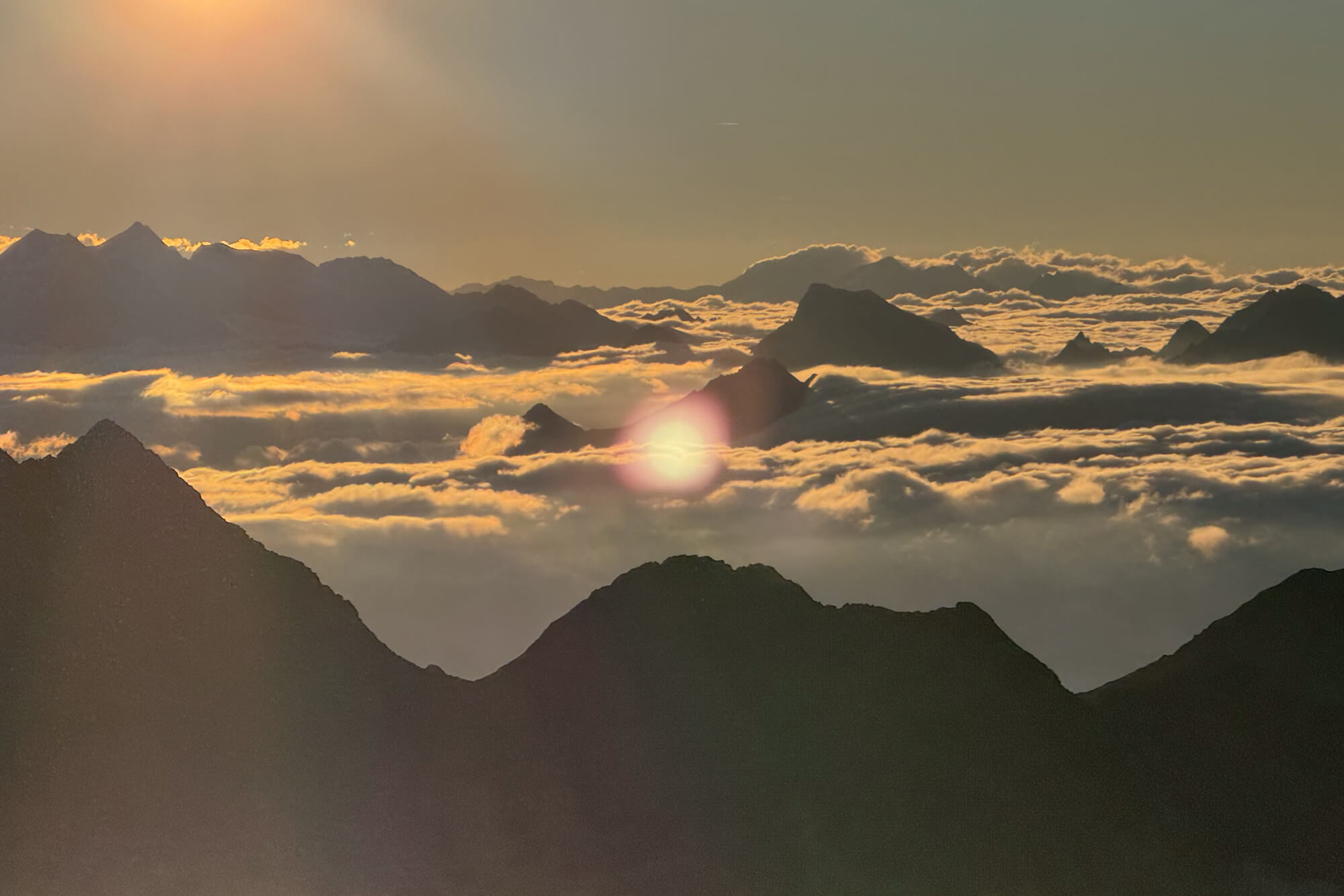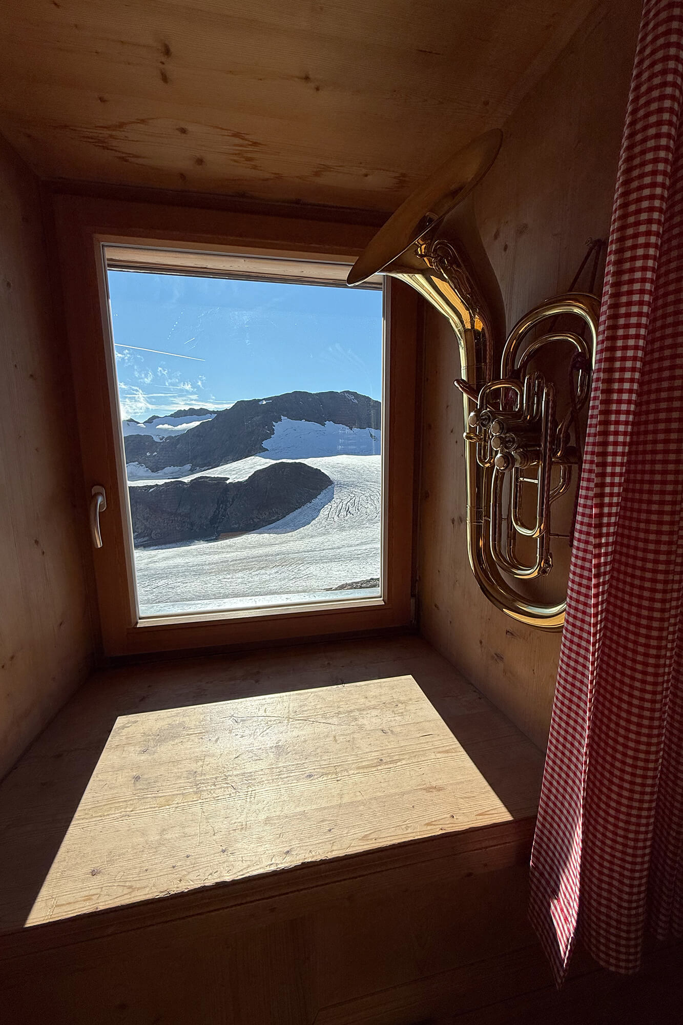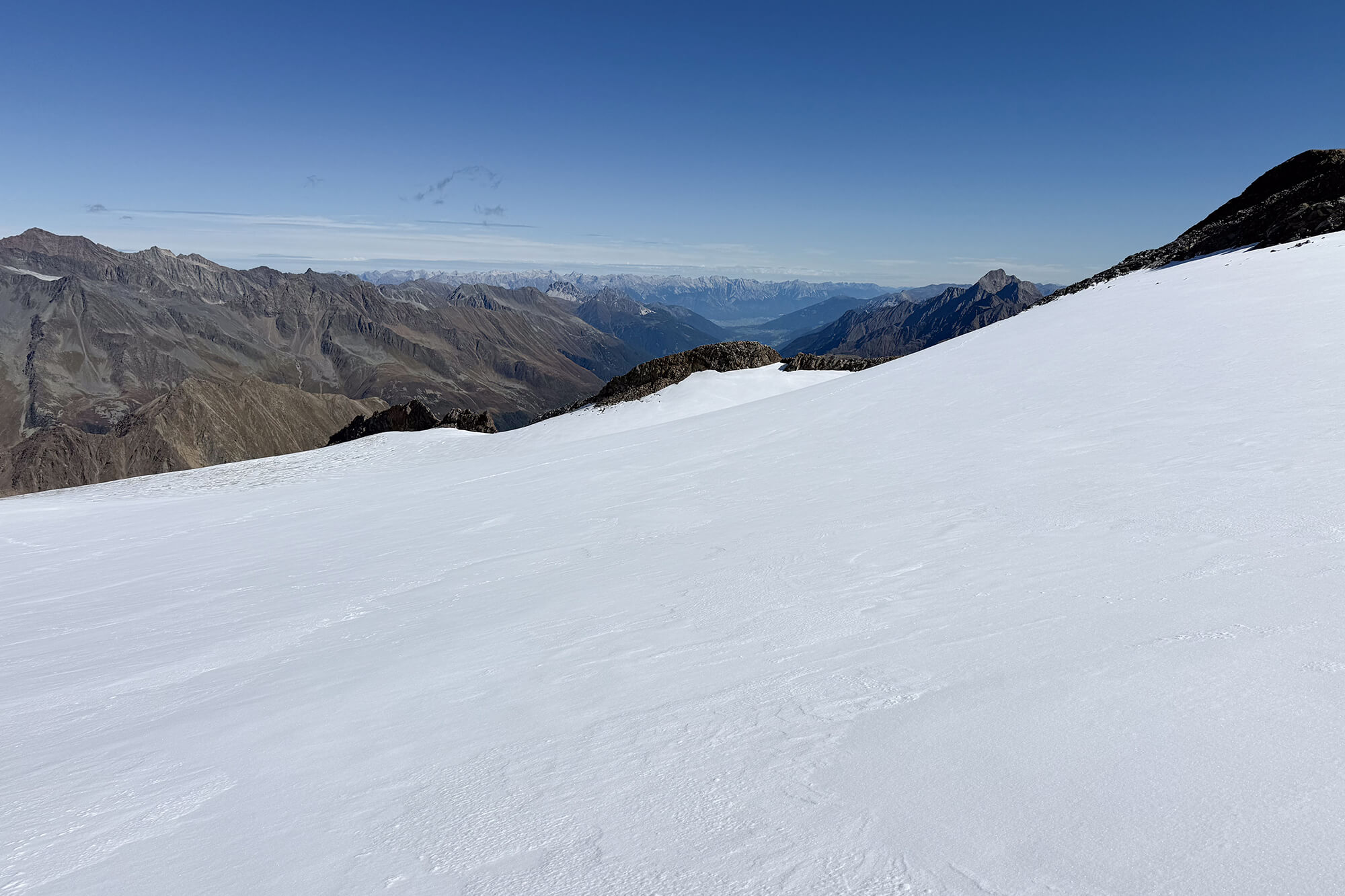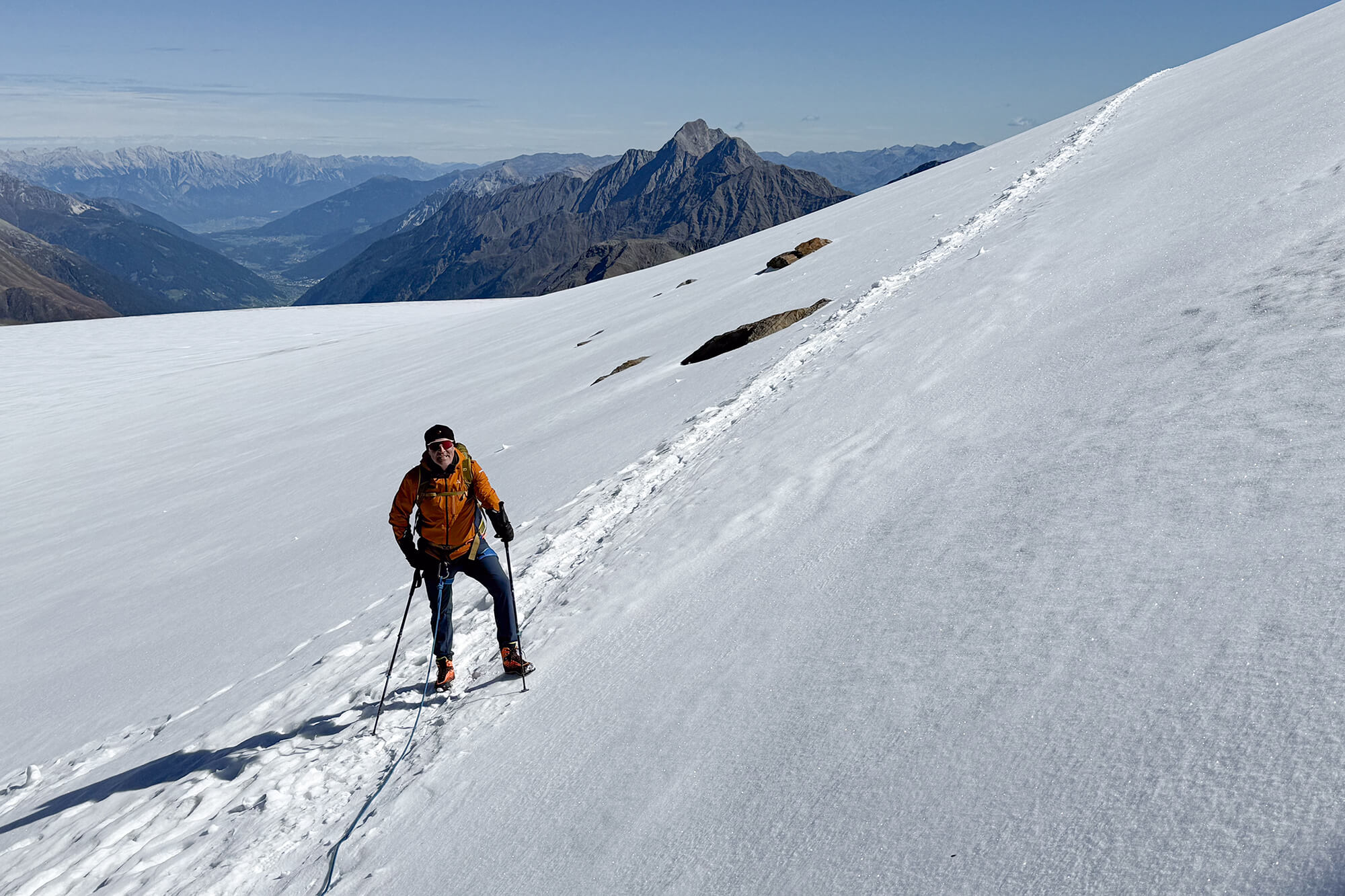 Am Pfaffensattel zwischen Zuckerhütl und Wildem Pfaff liegt der Sulzenaugletscher vor uns. Er ist frisch angezuckert und strahlt. Die Bedingungen könnten nicht besser sein. Einigen Gletscherspalten ausweichend gehen wir Richtung Westen zum Pfaffenjoch. Ein letzter Anstieg führt zum Felsrücken am Aperen Pfaff, danach beginnt der lange Abstieg über Fernau. Mehr als 24 Stunden verbringt man bei dieser Tour auf über Dreitausendmeter. Wenn man anschließend wieder tiefer gelangt, nimmt man Grün und Vegetation intensiver wahr als zuvor. An der Dresdner Hütte wartet Alex. Sie war heute bereits auf der Bänkenalm und erzählt begeistert von diesem schönen Ort. Während ein dreiköpfiges Musik-Ensamble volkstümlich musiziert kommt frischer Wind auf. Die Zeit für Hochtouren ist erst einmal vorbei. Wir leben in Einklang mit Witterung und der gegebenen Infrastruktur. Im Winter begleiten wir Skitouren aufs Zuckerhütl und den Wilden Freiger, sehr lohnende Unternehmungen. Aber erst einmal Fels und trockene Gefilde in den Herbstmonaten.