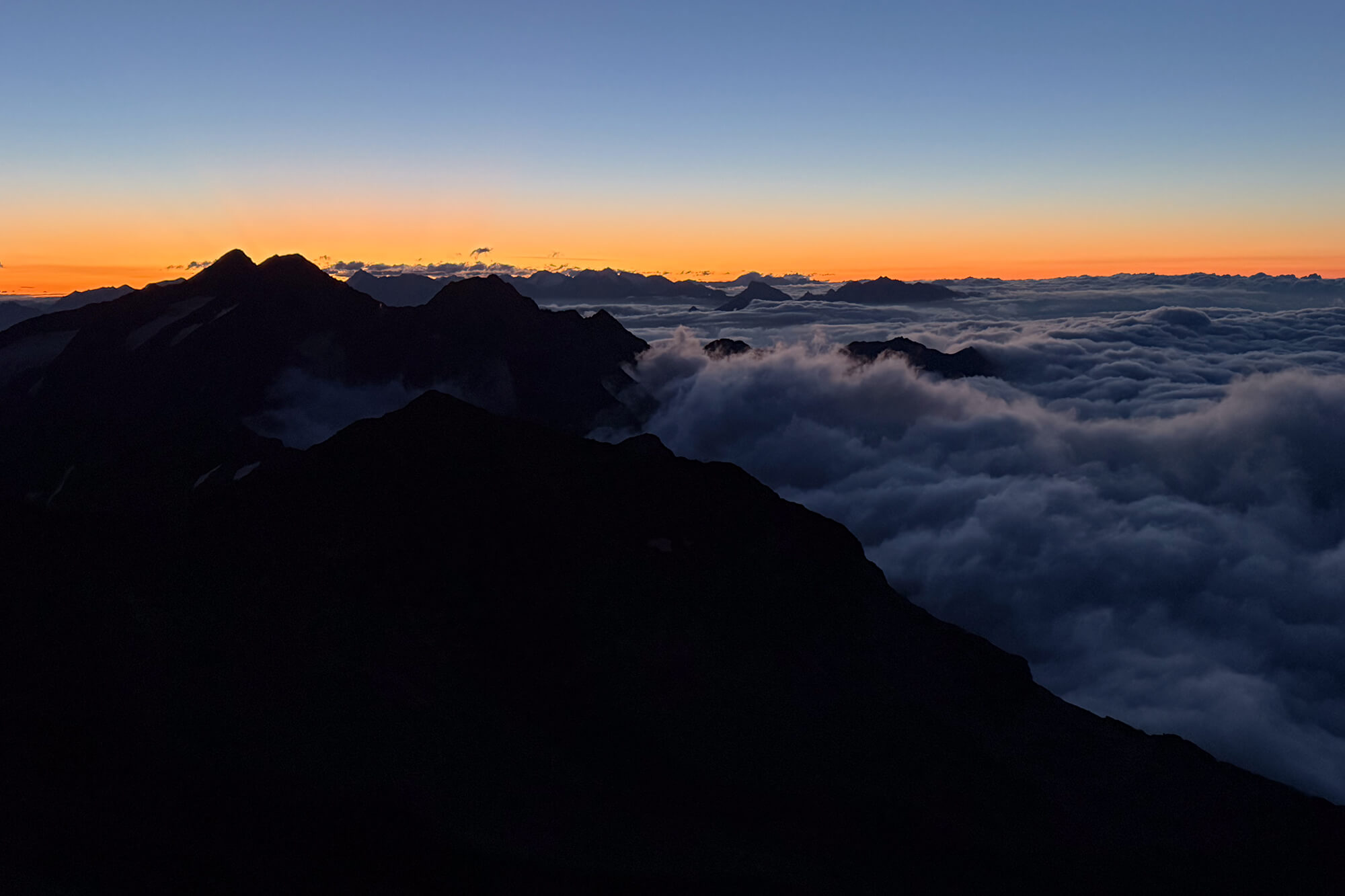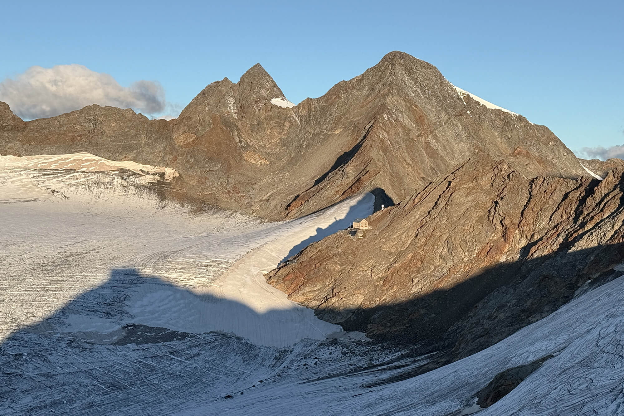 Will man ausgiebig Gletscher schaun, sollte man hier hoch. Das Becherhaus steht auf dem Gipfel des Becher (3.195m) und besonders nachmittags und am Morgen ist die Stimmung hier oben exzellent. Am Horizont im Süden sieht man die Dolomiten (wir befinden uns ja bereits in Südtirol). Das Gletscherbecken des Übeltalferners erscheint weit und die Umgebung mit etlichen Drteitausendergipfeln ist beeindruckend. Die Hütte wurde unlängst renoviert und Lukas, der Hüttenwirt, legt großen Wert auf Wohlfühlatmosphäre und Gemütlichkeit. Bis zum Abendessen sind wir draußen auf den Terrassen, dann geht die Sonne unter.